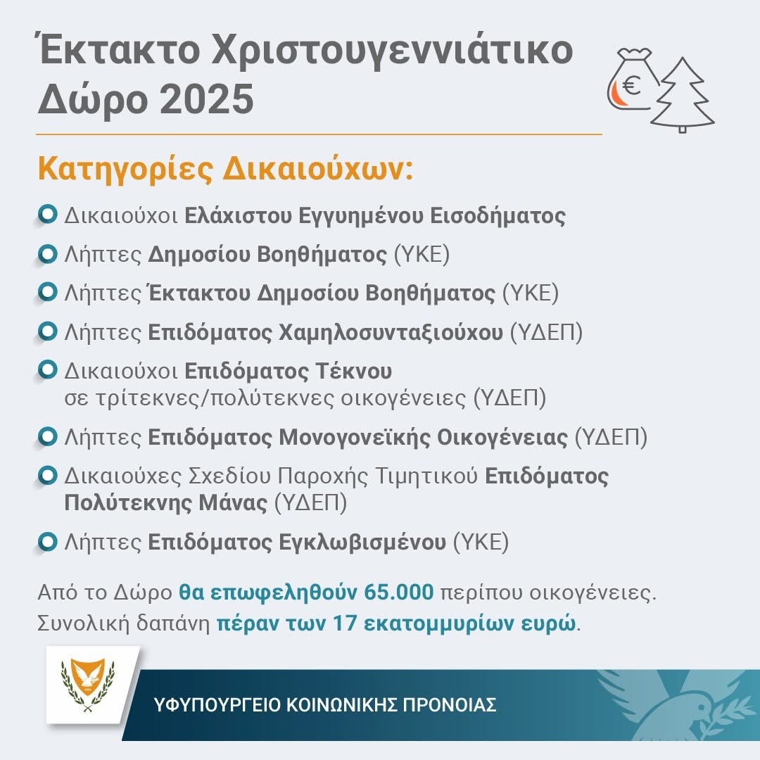 Με σταθερή προσήλωση στην κοινωνική αλληλεγγύη, η Πολιτεία συνεχίζει να βρίσκεται δίπλα στους πολίτες της, ειδικά σε όσους το έχουν περισσότερο ανάγκη. Με αυτό το μέτρο, τα φετινά Χριστούγεννα γίνονται λίγο πιο ζεστά, πιο ασφαλή και πιο φωτεινά για χιλιάδες οικογένειες σε όλη την Κύπρο.