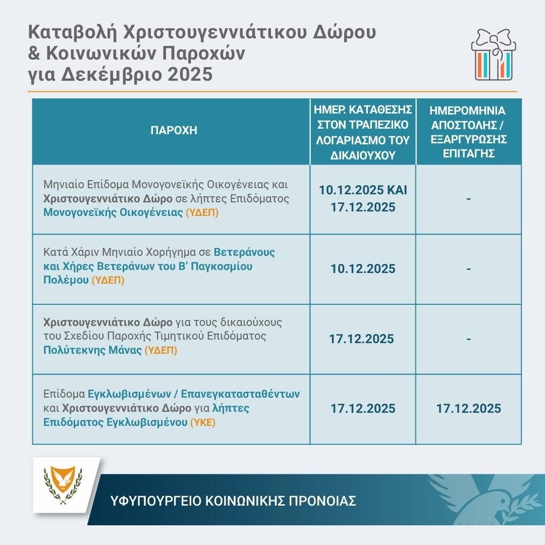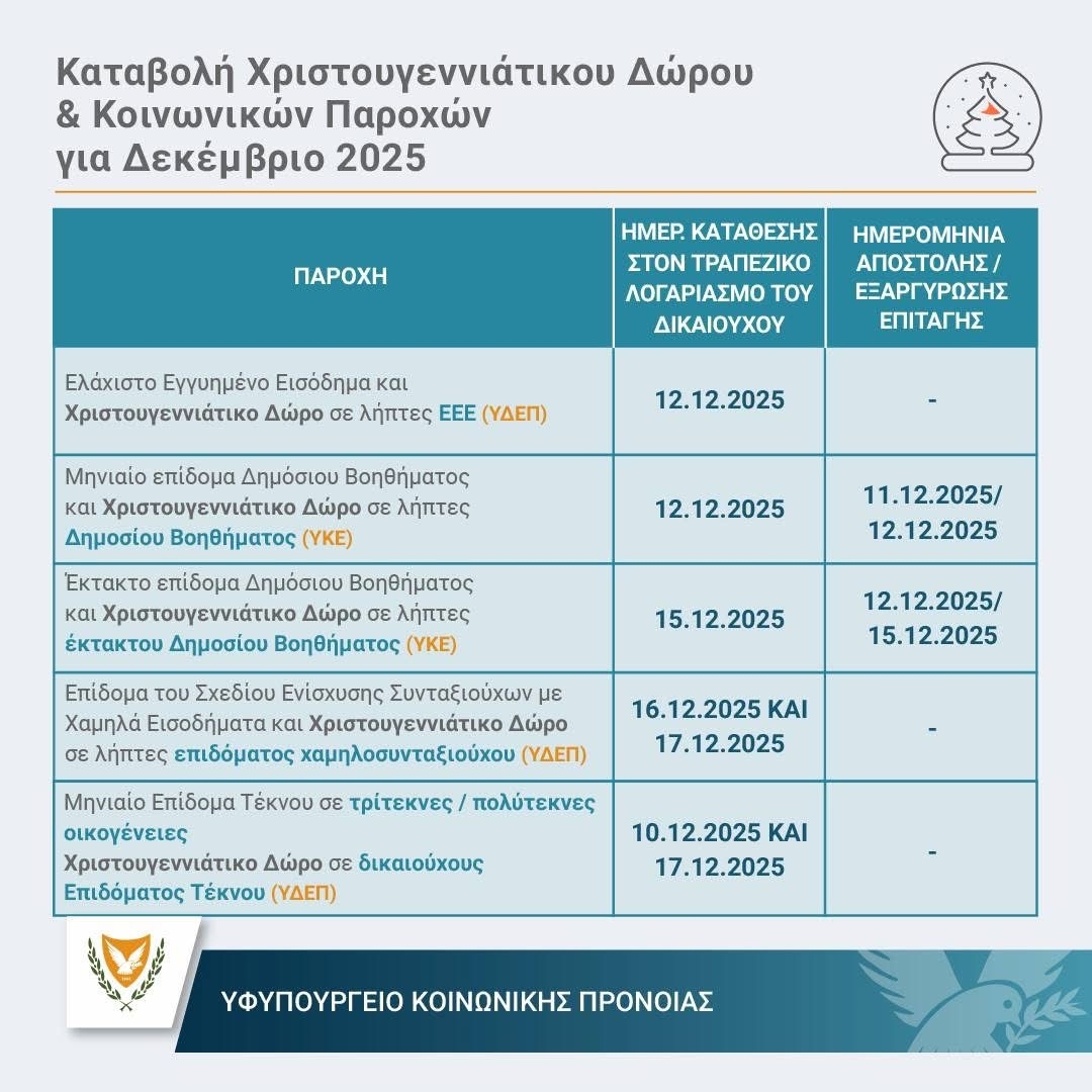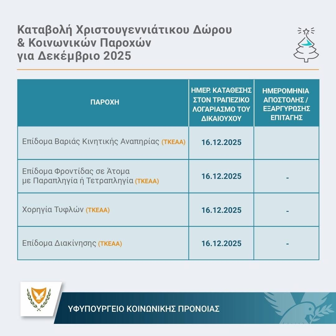 Ενόψει των εορτών των Χριστουγέννων, η Προεδρία ενημερώνει ότι το Υφυπουργείο Κοινωνικής Πρόνοιας, σε συνεργασία με τις Υπηρεσίες Κοινωνικής Ευημερίας (ΥΚΕ), την Υπηρεσία Διαχείρισης Επιδομάτων Πρόνοιας (ΥΔΕΠ) και το Τμήμα Κοινωνικής Ενσωμάτωσης Ατόμων με Αναπηρίες (ΤΚΕΑΑ), έχουν προβεί σε όλες τις απαραίτητες διευθετήσεις ώστε η καταβολή των επιδομάτων και άλλων κοινωνικών παροχών να πραγματοποιηθεί νωρίτερα, προσφέροντας ανακούφιση στους δικαιούχους ενόψει των εορτών.