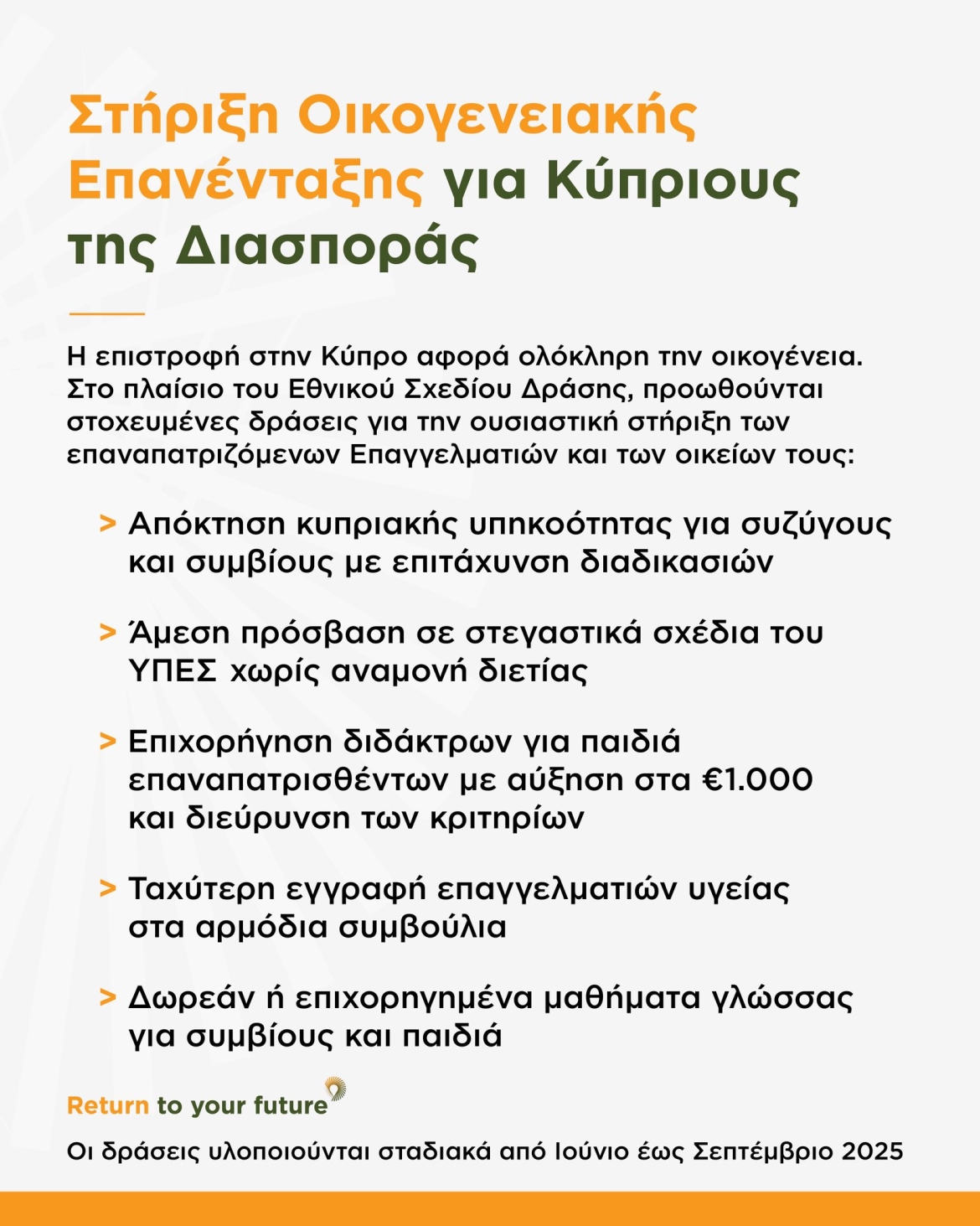 Αποτελεί έναν στοχευμένο χάρτη πορείας με σαφές χρονοδιάγραμμα και συγκεκριμένες δράσεις που διευκολύνουν και ενθαρρύνουν την επιστροφή στην πατρίδα.