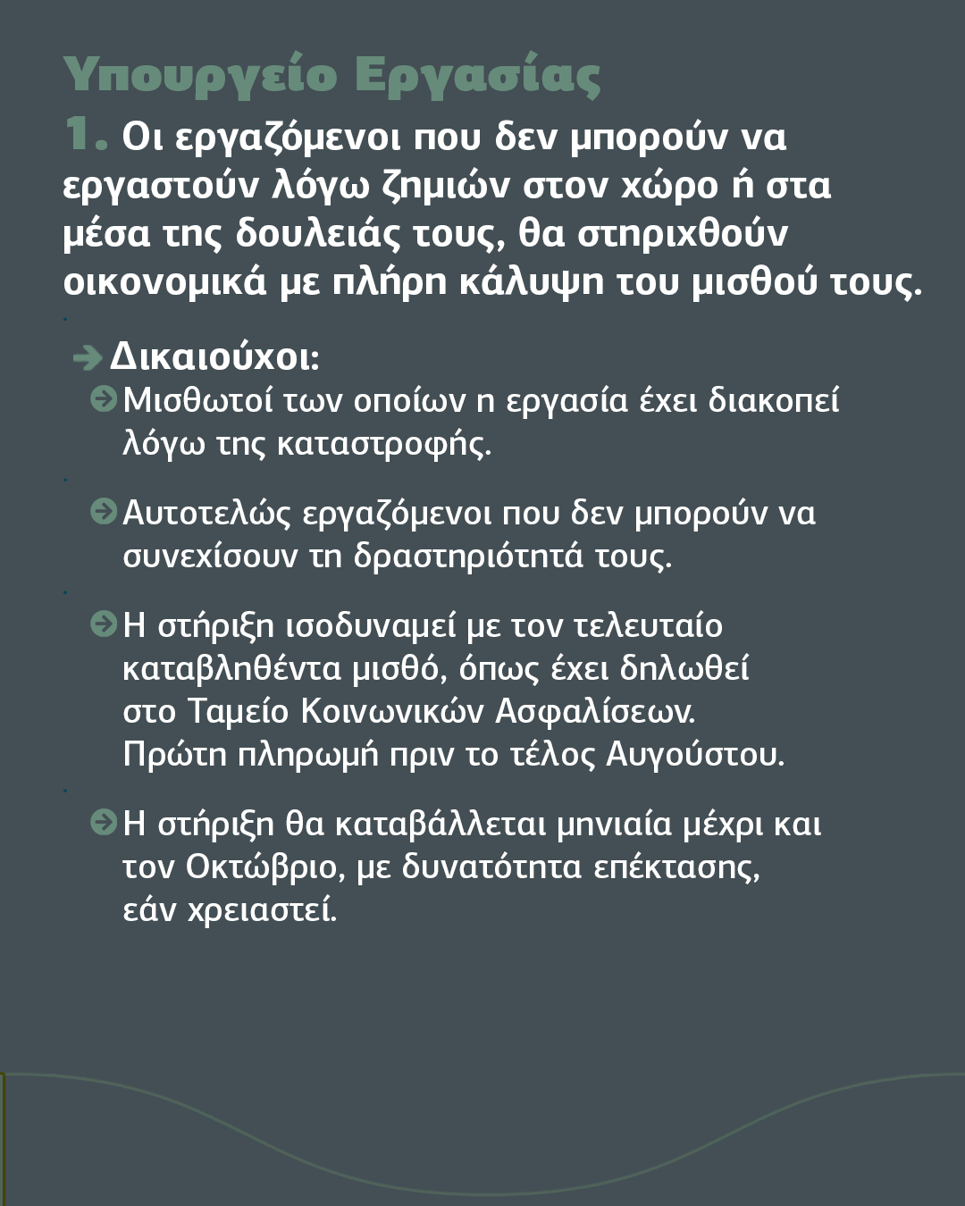 Οι εργαζόμενοι που δεν μπορούν να εργαστούν λόγω ζημιών στον χώρο ή στα μέσα της δουλειάς τους, θα στηριχθούν οικονομικά με πλήρη κάλυψη του μισθού τους.