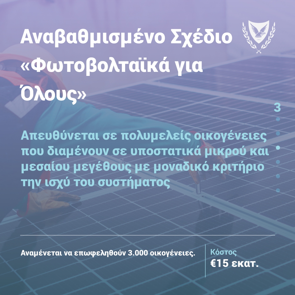 - Πρόσθετο κονδύλι €15 εκατ. για αναβαθμισμένο Σχέδιο «Φωτοβολταϊκά για Όλους» (δηλαδή χωρίς την καταβολή αρχικού κεφαλαίου), το οποίο να απευθύνεται επίσης σε πολυμελείς οικογένειες που διαμένουν σε υποστατικά μικρού και μεσαίου μεγέθους με μοναδικό κριτήριο την ισχύ του συστήματος. Από το εν λόγω μέτρο αναμένεται να επωφεληθούν 3.000 οικογένειες.