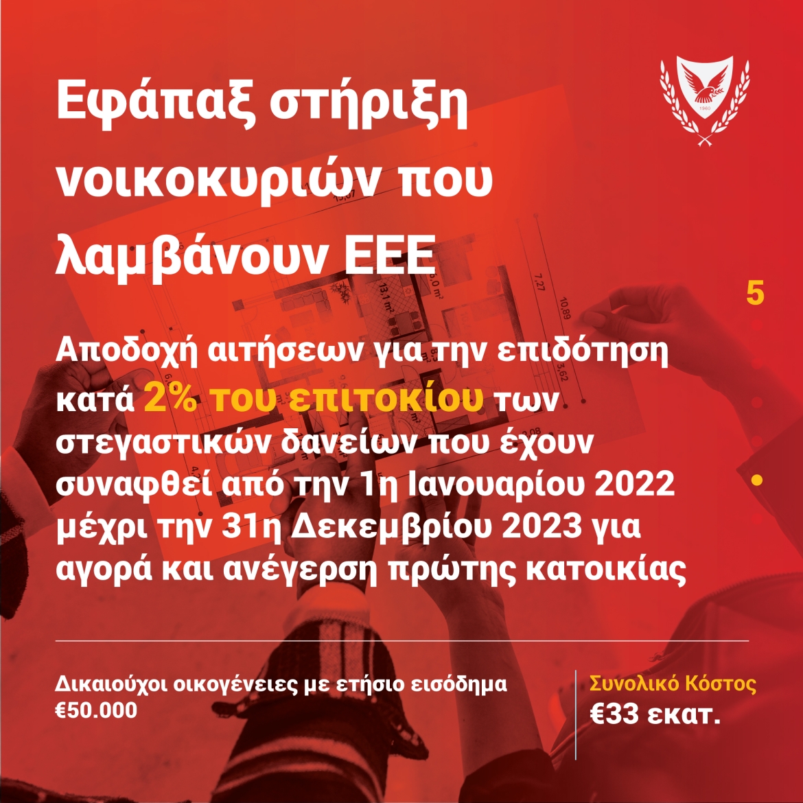 - Το Υπουργείο Εσωτερικών θέτει σε εφαρμογή το Σχέδιο στεγαστικής επιδότησης νεαρών ζευγαριών ή και νέων μέχρι 41 ετών με παραχώρηση εφάπαξ χορηγίας από €20.000 μέχρι €50.000, στη βάση εισοδηματικών κριτηρίων.Με το μέτρο αυτό, συνολικής δαπάνης €15 εκατ. θα επωφεληθούν 400 νέοι.