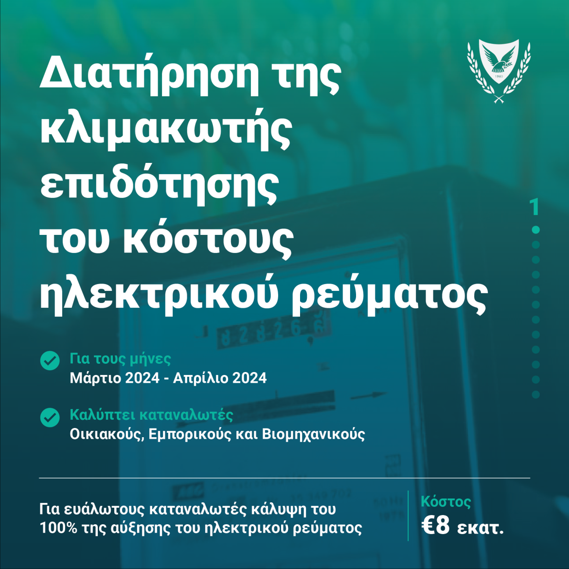 - Παράταση του μέτρου κλιμακωτής επιδότησης του κόστους ηλεκτρικού ρεύματος από την 1η Μαρτίου μέχρι τις 30 Απριλίου 2024 για οικιακούς, εμπορικούς και βιομηχανικούς καταναλωτές, ενώ για τους ευάλωτους καταναλωτές η επιδότηση θα καλύπτει το 100% της αύξησης της τιμής του ηλεκτρικού ρεύματος.