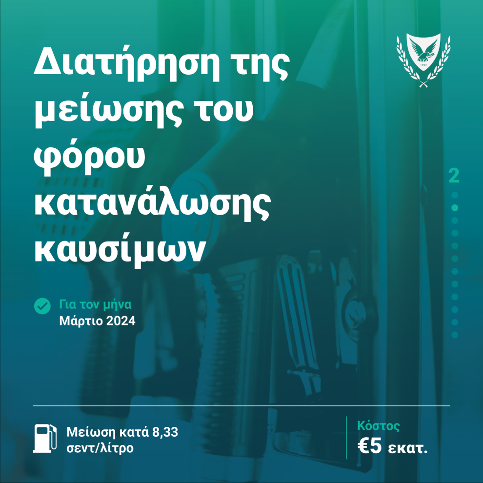 - Παράταση του μέτρου μείωσης του φόρου κατανάλωσης στα καύσιμα κίνησης μέχρι τις 31 Μαρτίου 2024.
