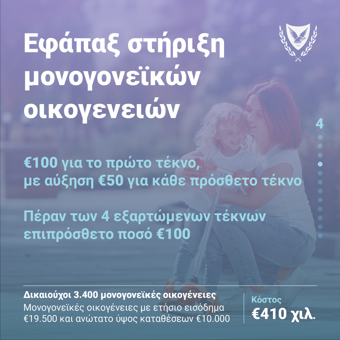 - Εφάπαξ στήριξη για κάθε τέκνο με μέγιστο ποσό 250 ευρώ σε μονογονεϊκές οικογένειες. Οικογένειες με πέραν των τεσσάρων εξαρτώμενων τέκνων θα λαμβάνουν επιπρόσθετο ποσό.