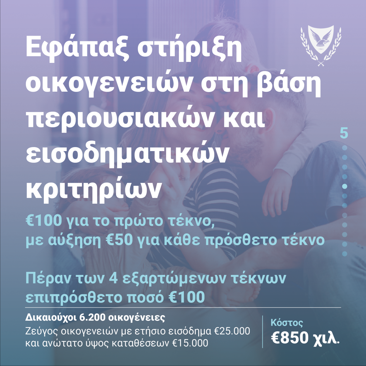 - Εφάπαξ στήριξη για κάθε τέκνο με μέγιστο ποσό τα 250 ευρώ σε όλες τις οικογένειες. Οικογένειες με πέραν των τεσσάρων εξαρτώμενων τέκνων θα λαμβάνουν επιπρόσθετο ποσό.