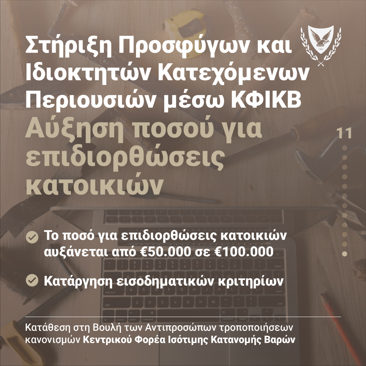- Αύξηση επιδότησης από 50.000 σε 100.000 ευρώ για επιδιορθώσεις σε κατοικίες χωρίς εισοδηματικά κριτήρια.