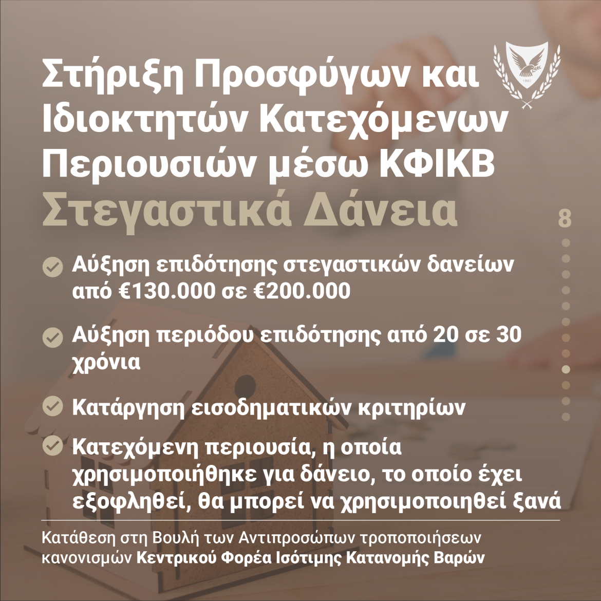 - Για περιουσίες στις κατεχόμενες περιοχές, οι οποίες χρησιμοποιήθηκαν για δάνειο και ακολούθως εξοφλήθηκαν, θα μπορούν πλέον να χρησιμοποιηθούν ξανά σε σχετική αίτηση στον Κεντρικό Φορέα Ισότιμης Κατανομής Βαρών.
