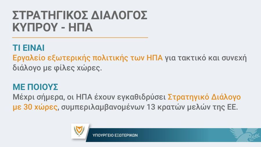 Στις 17 Ιουνίου 2024, ο Υπουργός Εξωτερικών, κος Κ. Κόμπος, υπέγραψε κατά την επίσκεψη του, στις Ηνωμένες Πολιτείες συμφωνία θεσμοθέτησης του Στρατηγικού Διαλόγου της Κυπριακής Δημοκρατίας και των Ηνωμένων Πολιτειών Αμερικής (ΗΠΑ). Η συμφωνία αναβαθμίζει και ενισχύει σημαντικά τη στρατηγικής φύσεως σχέση με τις ΗΠΑ, σε μια σημαντική χρονική συγκυρία. Την ίδια ώρα, σημαντικές για την κυπριακή οικονομία είναι οι προοπτικές που διανοίγονται για επενδύσεις στη χώρα μας, καθώς επίσης και για την ενίσχυση των εμπορικών σχέσεων μας με τις ΗΠΑ. Παράγοντες καθοριστικοί στην προσπάθεια που καταβάλλουμε για ενίσχυση και θωράκιση της Κυπριακής Δημοκρατίας.