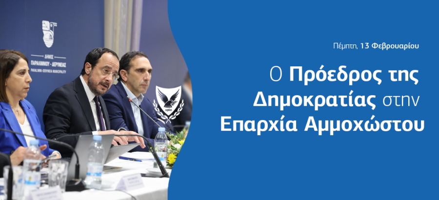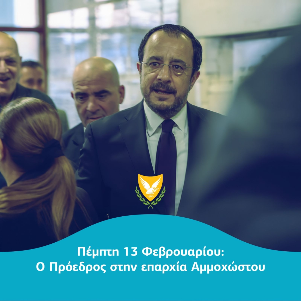 Ο Πρόεδρος της Δημοκρατίας, κατά την επίσκεψή του στις 13/2/2025 στην Επαρχία Αμμοχώστου, ανέδειξε τον σημαντικό ρόλο που διαδραματίζει η περιοχή στην οικονομία της Κύπρου, με έμφαση στον τουρισμό, στον πρωτογενή τομέα και στις εξαγωγές.