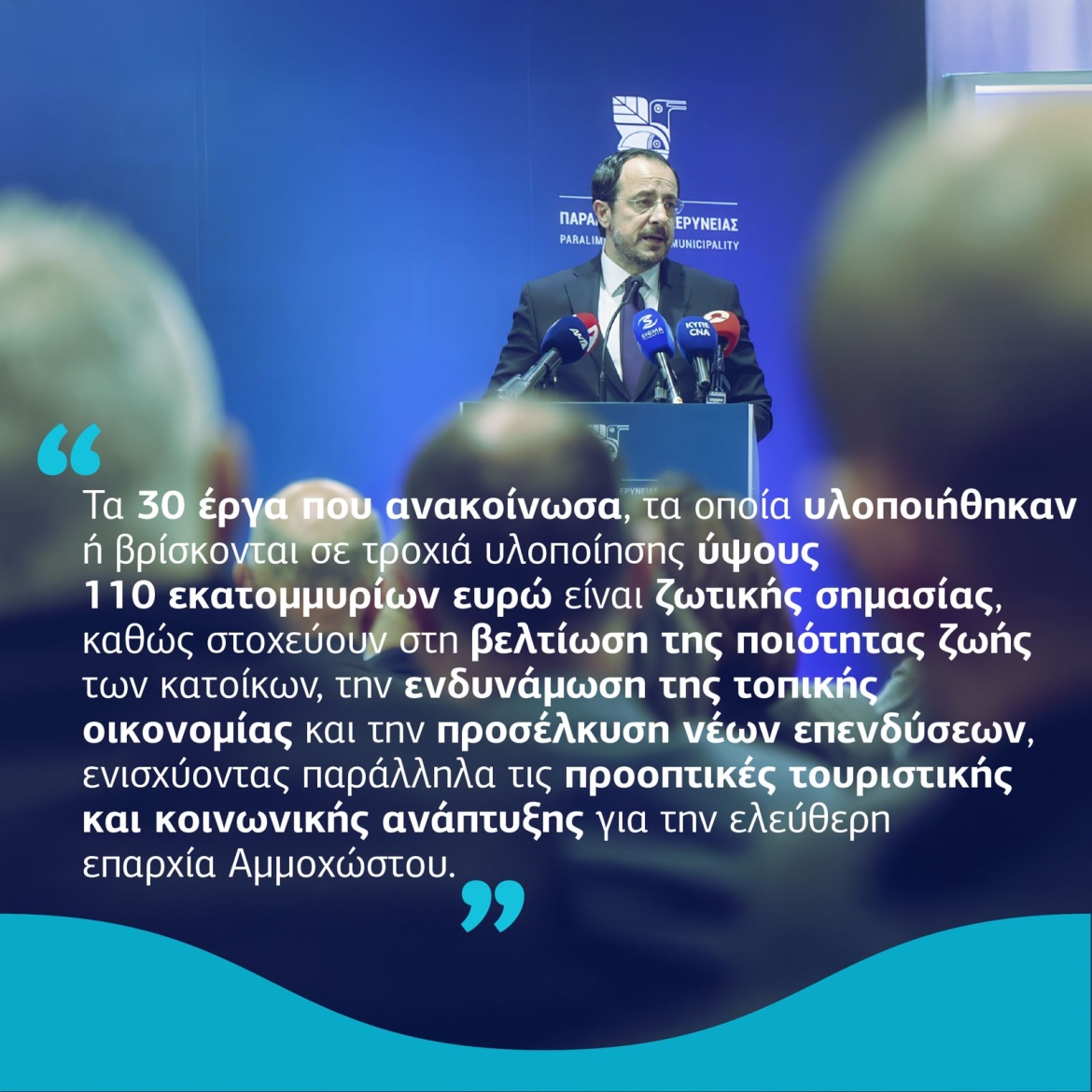 Ο ΠτΔ, Νίκος Χριστοδουλίδης ανακοίνωσε στρατηγικές επενδύσεις, κοινωνική πολιτική και υποδομές που μεταμορφώνουν την περιοχή της Επαρχίας Αμμοχώστου, η οποία αναπτύσσεται με σαφές σχέδιο και όραμα