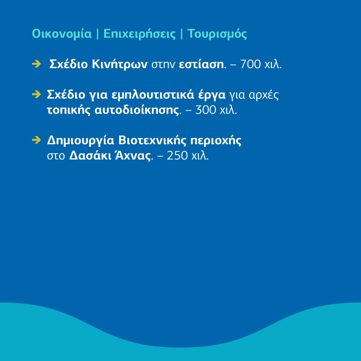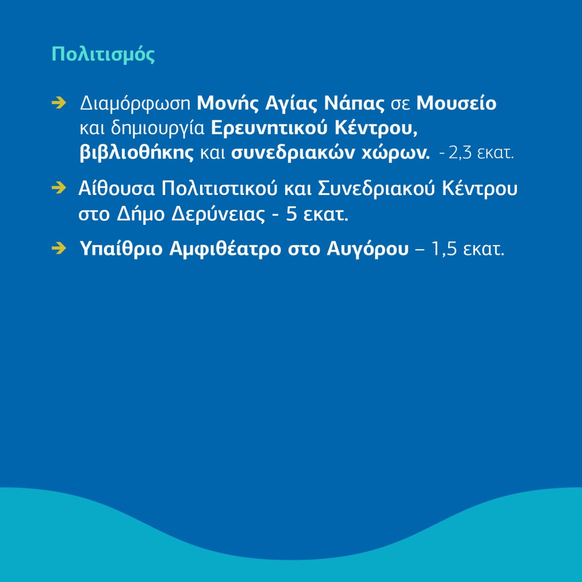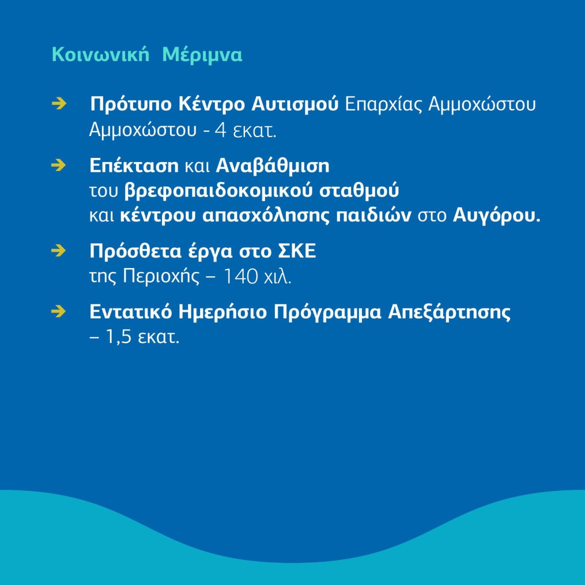 ✔ Πράσινη ανάπτυξη και διαχείριση αποβλήτων, με την ολοκλήρωση του Πράσινου Σημείου Αγίας Νάπας και τη δημιουργία νέων σε Αυγόρου, Σωτήρα και Δερύνεια, καθώς και την εγκατάσταση φωτοβολταϊκών στο Νοσοκομείο Αμμοχώστου (1 εκατ. ευρώ).