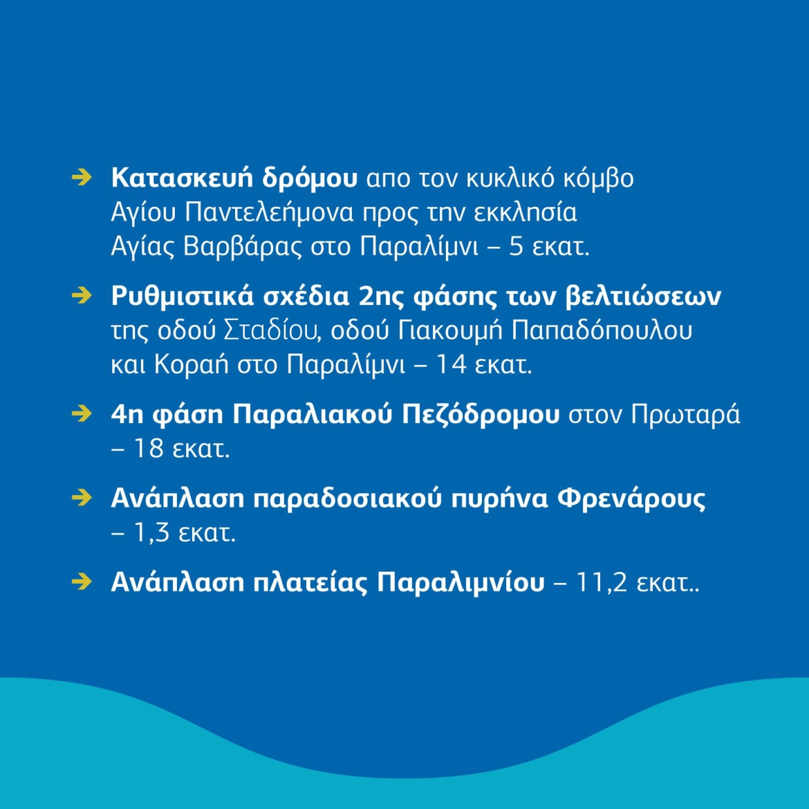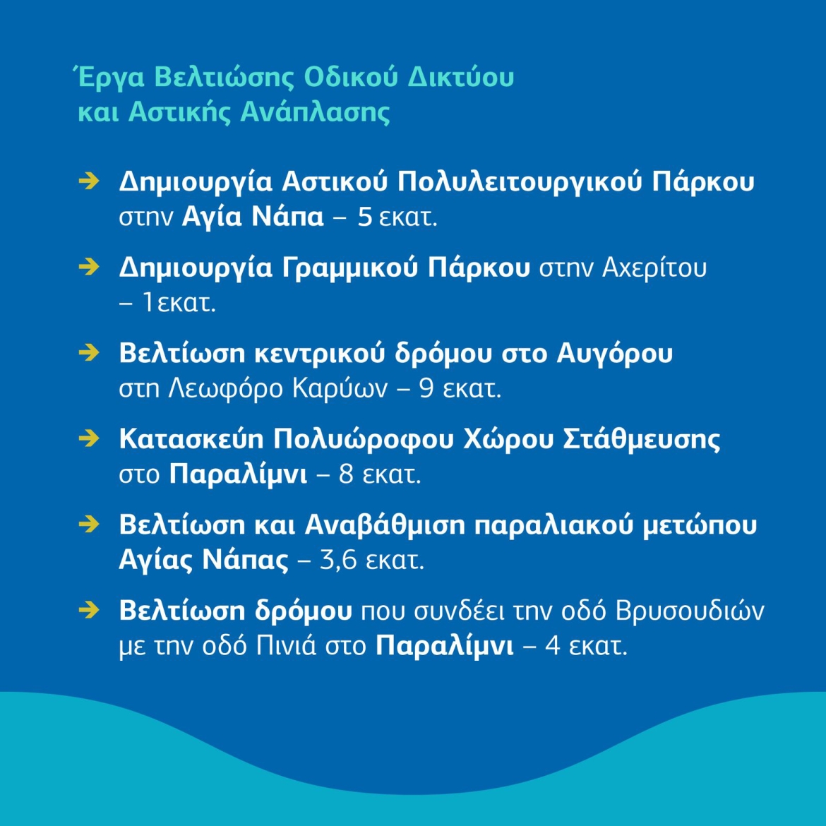 ✔ Οδικά έργα ύψους πολλών εκατομμυρίων ευρώ, όπως η βελτίωση του κεντρικού δρόμου Αυγόρου (9 εκατ. ευρώ), η κατασκευή πολυώροφου χώρου στάθμευσης στο Παραλίμνι (8 εκατ. ευρώ) και η παραλιακή ανάπλαση Αγίας Νάπας (3,6 εκατ. ευρώ).
