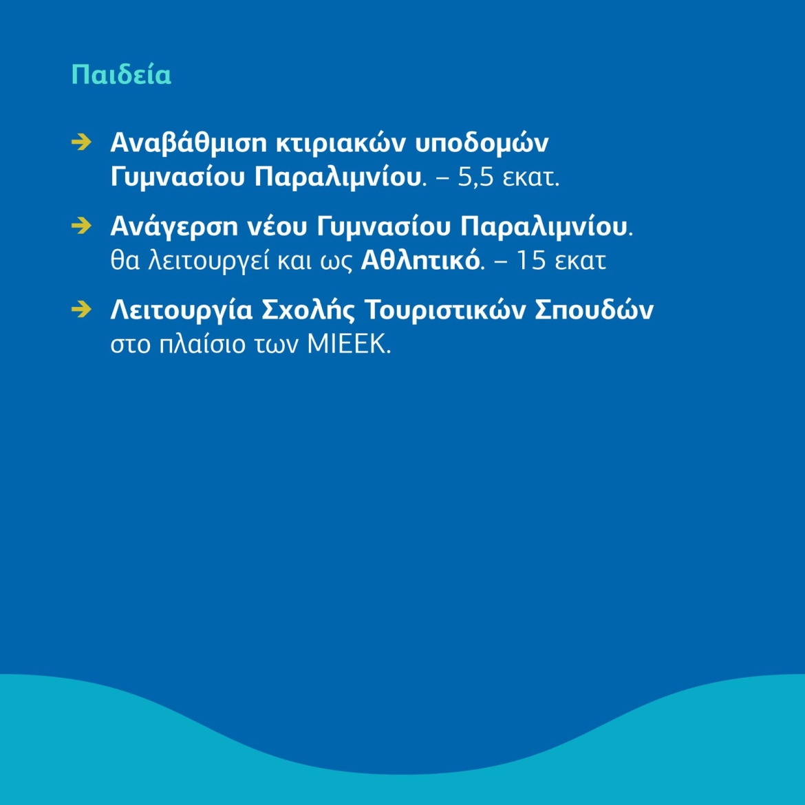 ✔ Αναβαθμίζεται το Γυμνάσιο Παραλιμνίου (5,5 εκατ. ευρώ) και ανεγείρεται νέο αθλητικό γυμνάσιο στην περιοχή. Παράλληλα, στηρίζεται η δημιουργία τριτοβάθμιων εκπαιδευτικών ιδρυμάτων στην Επαρχία.