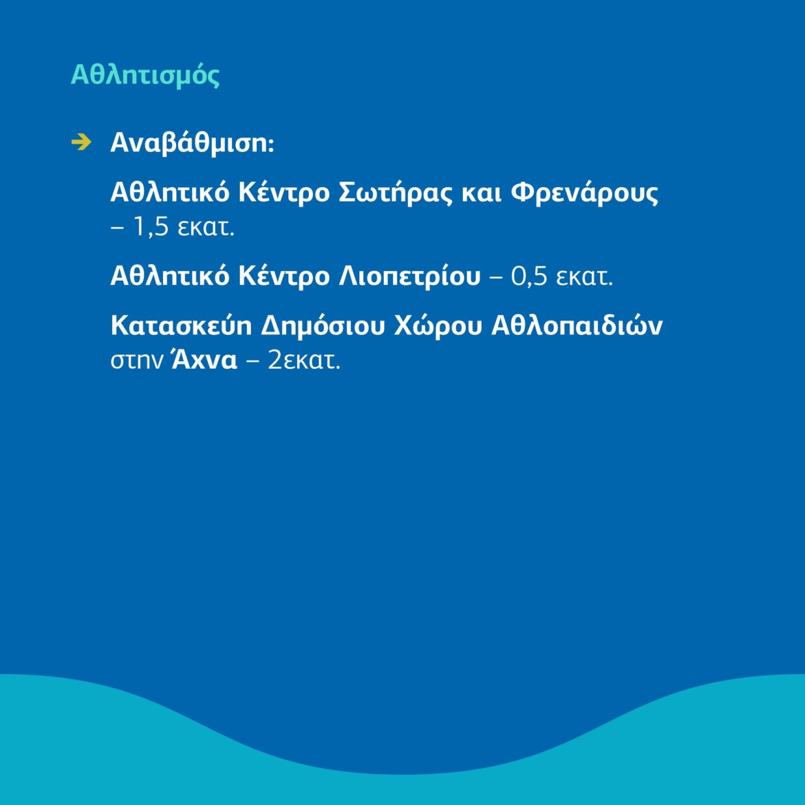 ✔ Στον τομέα του αθλητισμού, προχωρούν η αναβάθμιση των αθλητικών κέντρων Φρενάρους, Σωτήρας και Λιοπετρίου, καθώς και η δημιουργία δημόσιου χώρου αθλοπαιδιών στην Άχνα.