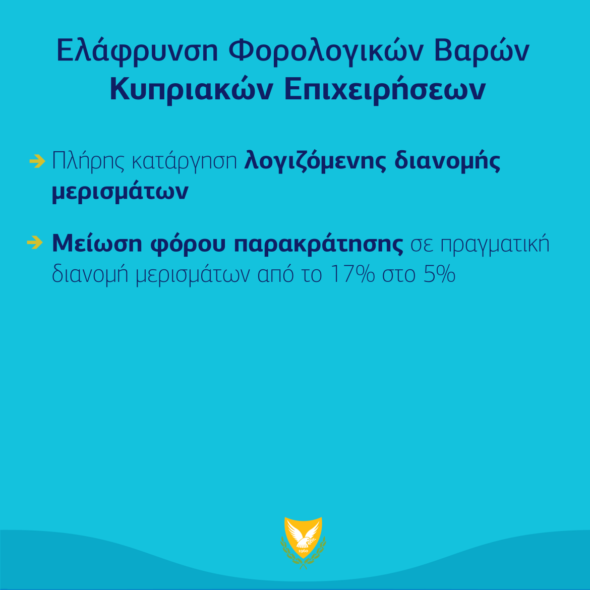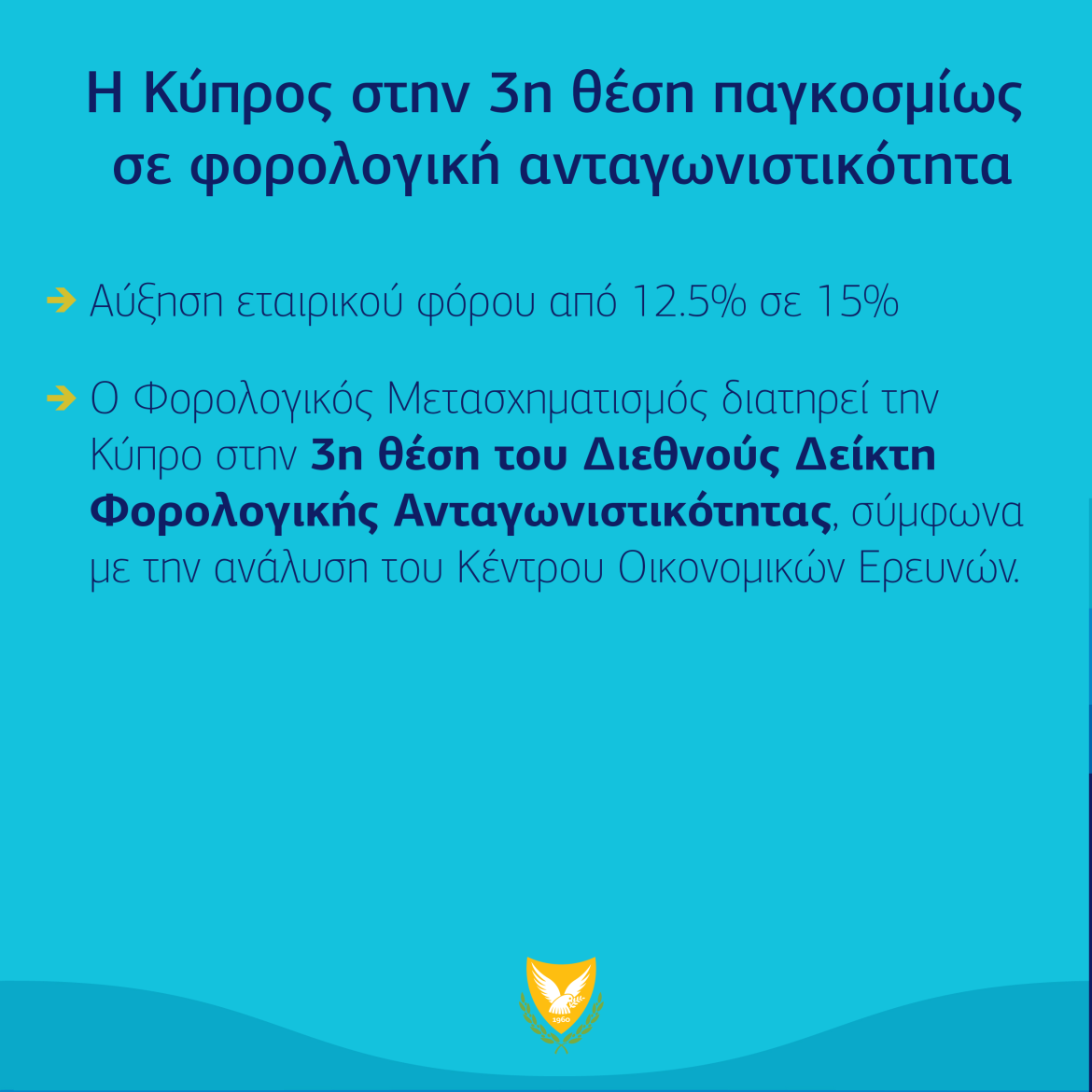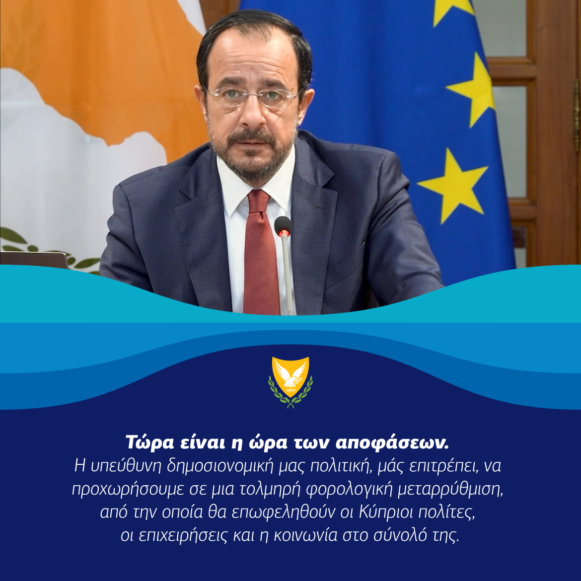 Με τη μεταρρύθμιση αυτή, η Κύπρος κάνει ένα αποφασιστικό βήμα προς ένα σύγχρονο, ανταγωνιστικό και κοινωνικά δίκαιο φορολογικό σύστημα, ένα σύστημα που ανταποδίδει στην κοινωνία, ενθαρρύνει την ανάπτυξη και εμπεδώνει την εμπιστοσύνη των πολιτών στο κράτος.