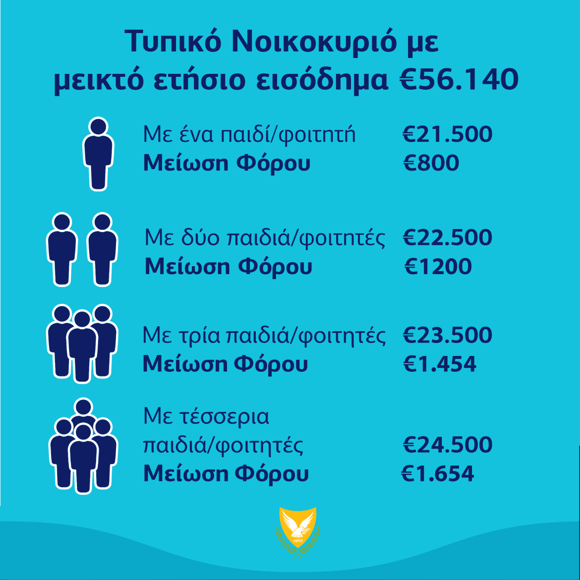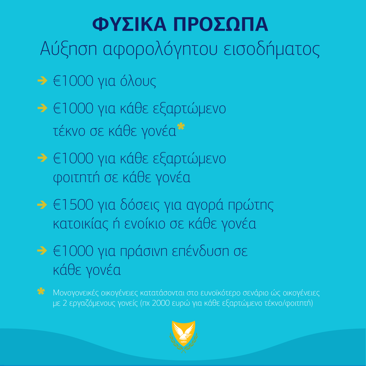 - Αύξηση του αφορολόγητου εισοδήματος κατά €1.000, διαμορφώνοντας το νέο όριο στις €20.500, με δυνατότητα να ξεπεράσει τις €24.500 για οικογένειες με εξαρτώμενα μέλη και ειδικές δαπάνες.