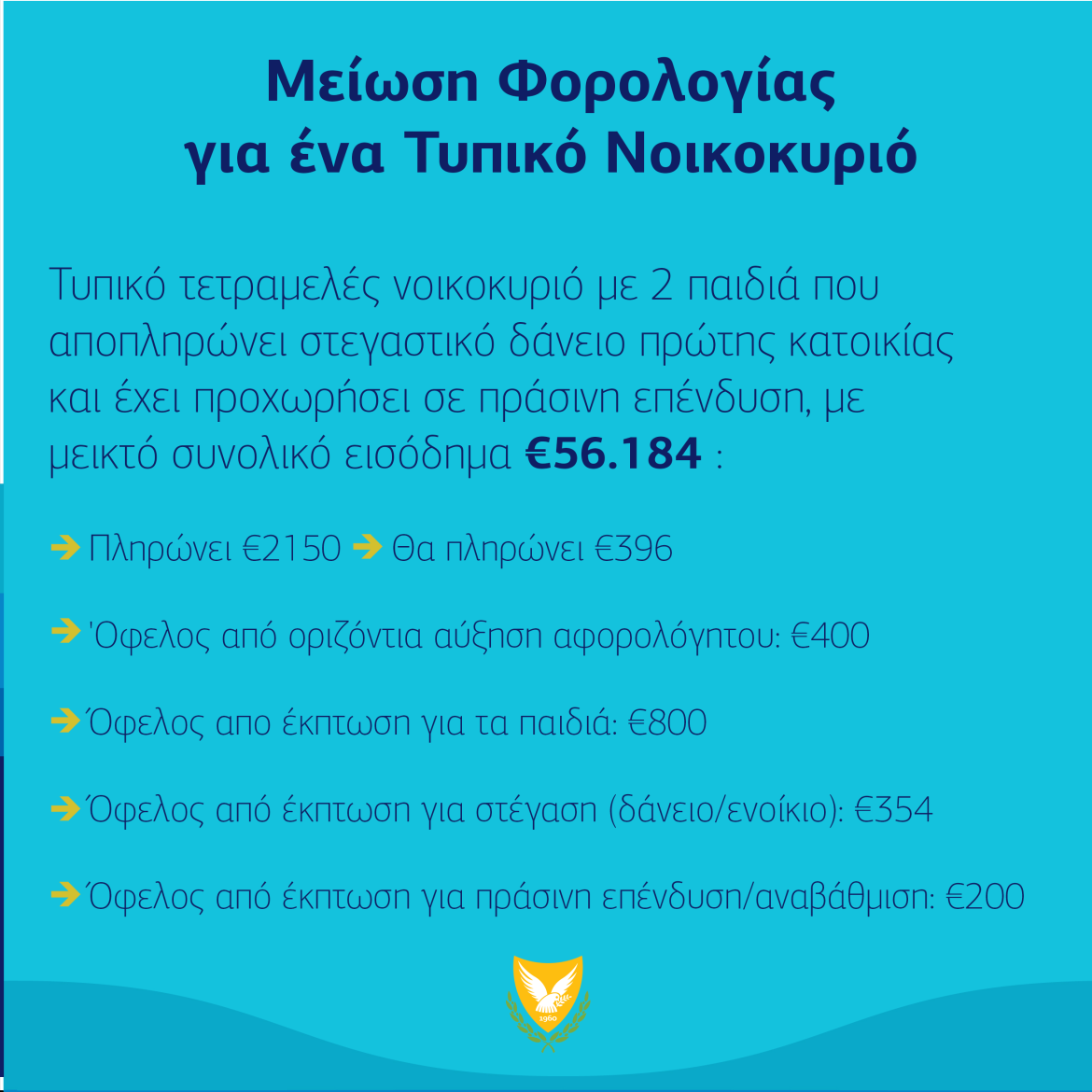- Θεσπίζονται στοχευμένες φοροαπαλλαγές για οικογένειες, στεγαστικά δάνεια, πράσινες επενδύσεις και ηλεκτρικά οχήματα.