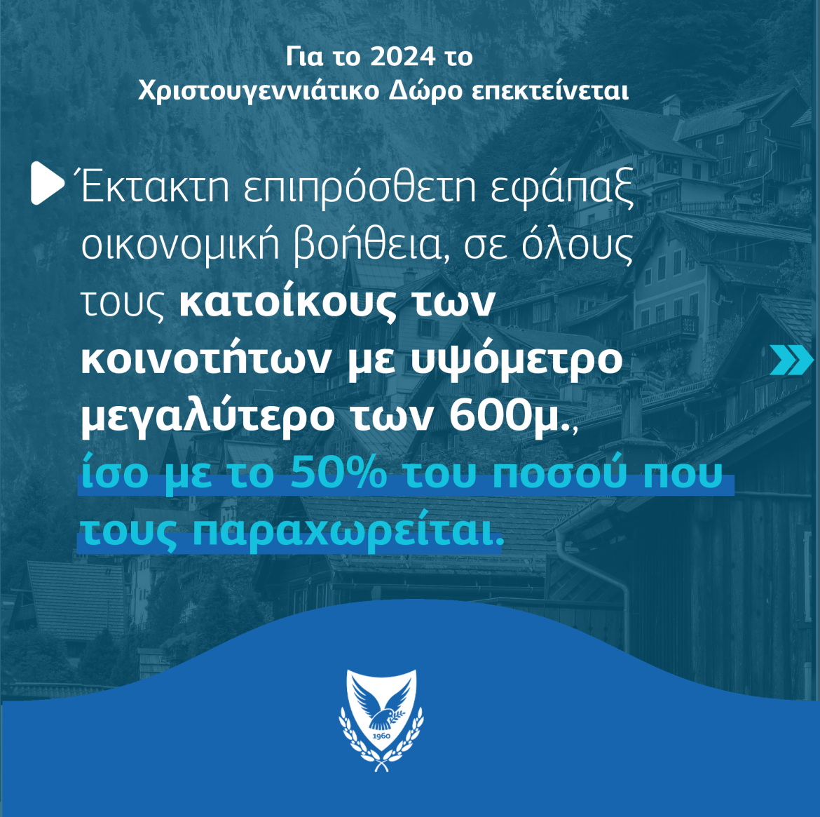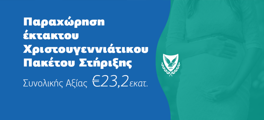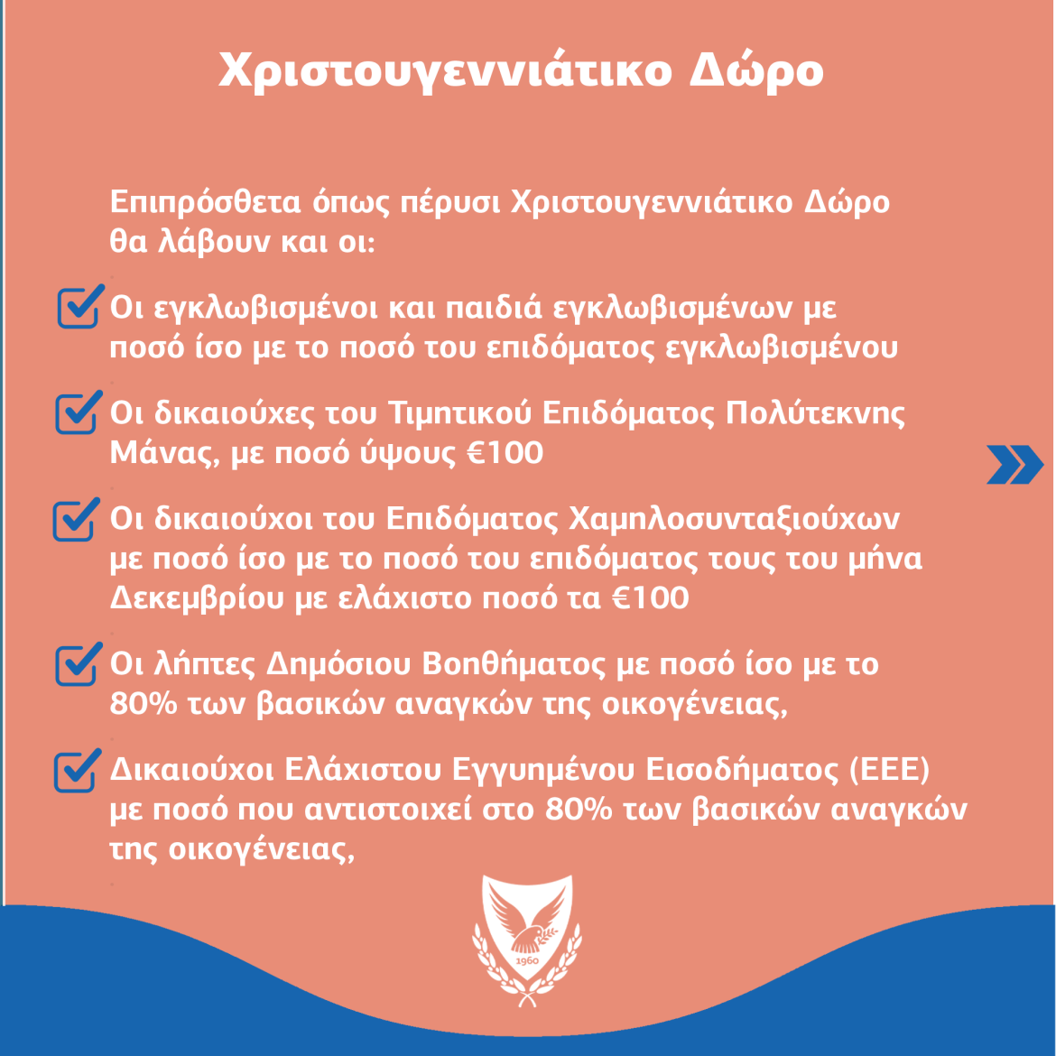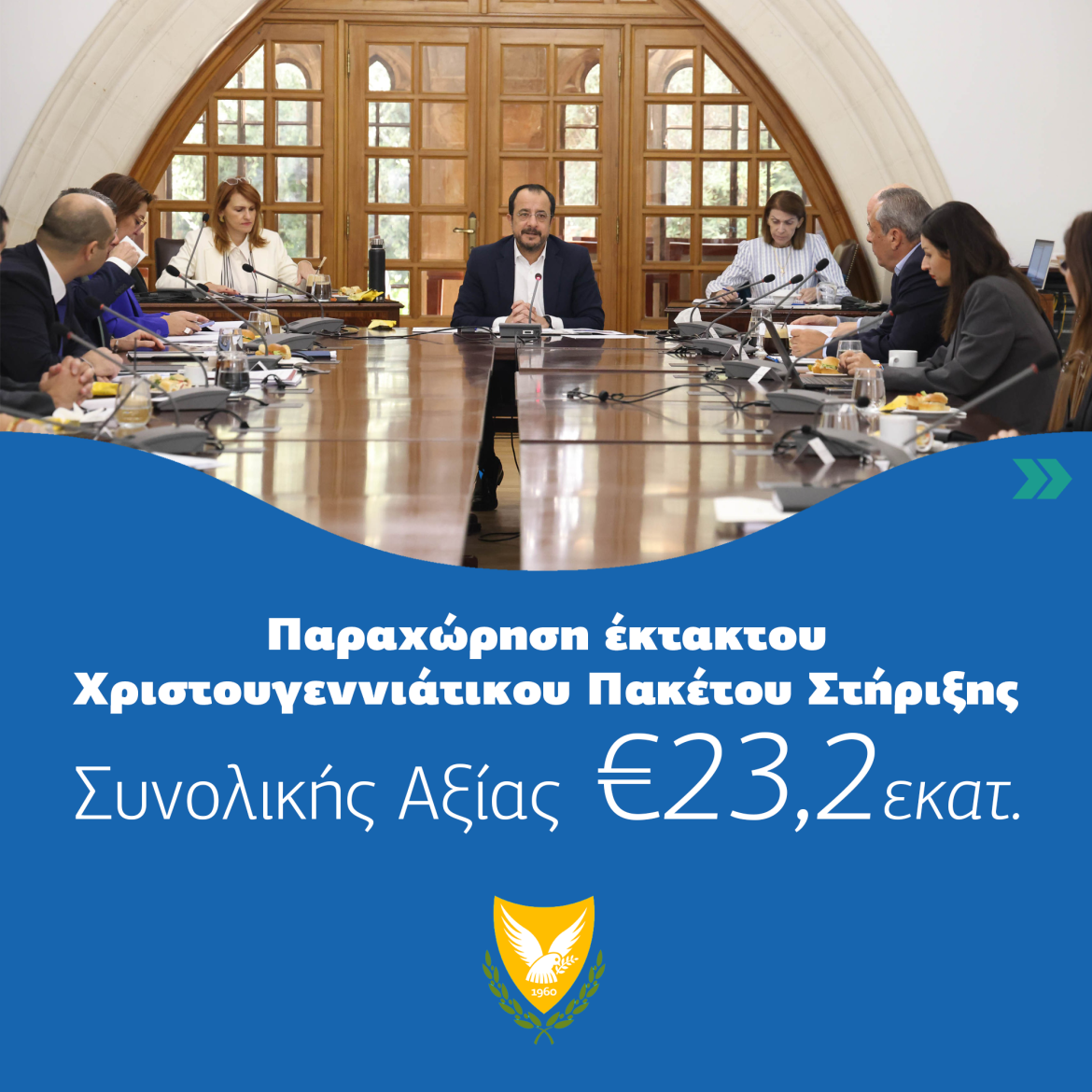 Η Κυβέρνηση, υλοποιώντας τις δεσμεύσεις της στο πλαίσιο του προγράμματος διακυβέρνησης του Προέδρου Νίκου Χριστοδουλίδη, προχωρά στην παραχώρηση έκτακτου χριστουγεννιάτικου δώρου για το 2024, εστιάζοντας στην ουσιαστική στήριξη των πιο ευάλωτων ομάδων του πληθυσμού.