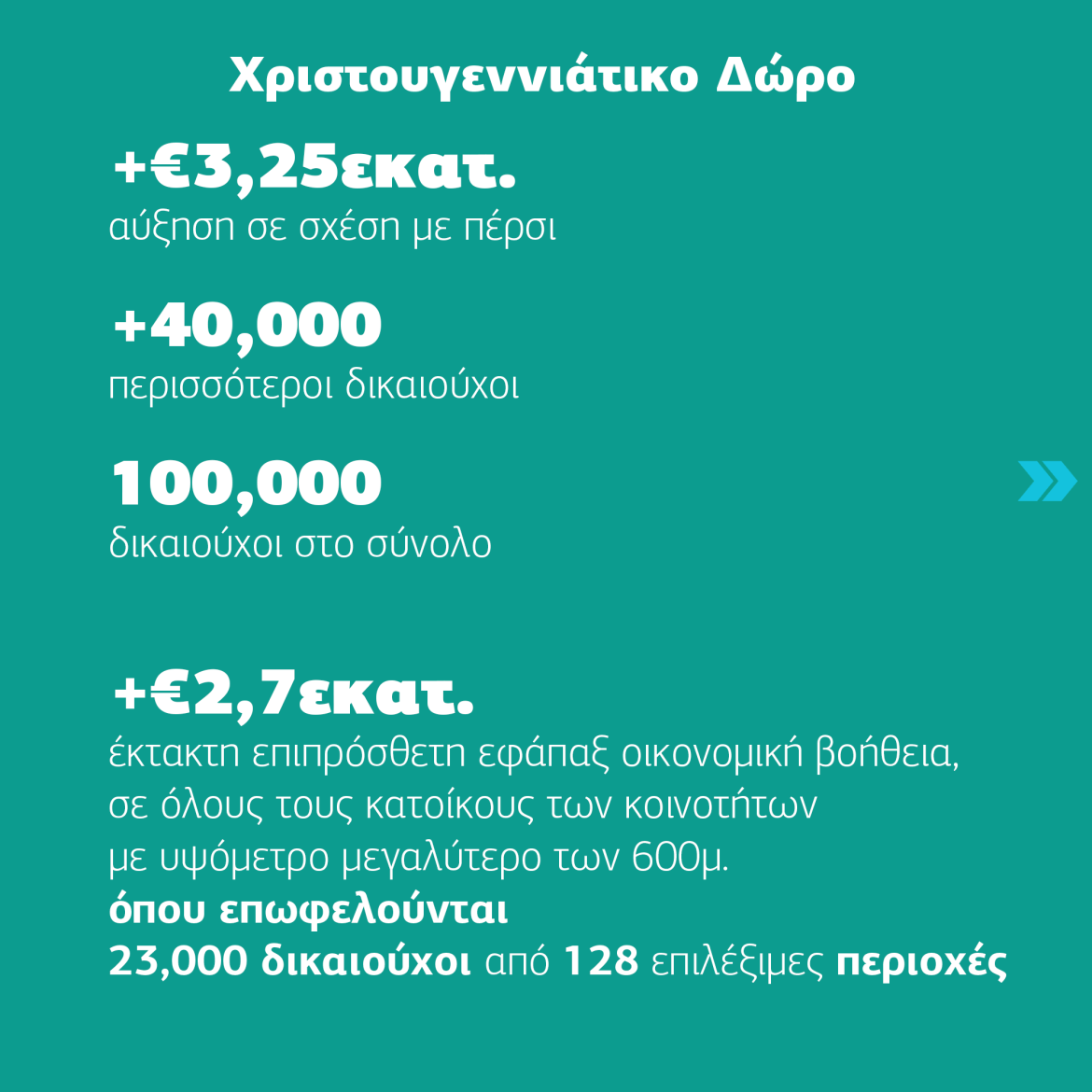 Το έκτακτο χριστουγεννιάτικο δώρο αποτελεί ένα ακόμη βήμα για την υλοποίηση του οράματος της Κυβέρνησης, που θέτει στο επίκεντρο την ευημερία των πολιτών και την οικοδόμηση ενός μέλλοντος με ίσες ευκαιρίες για όλους.