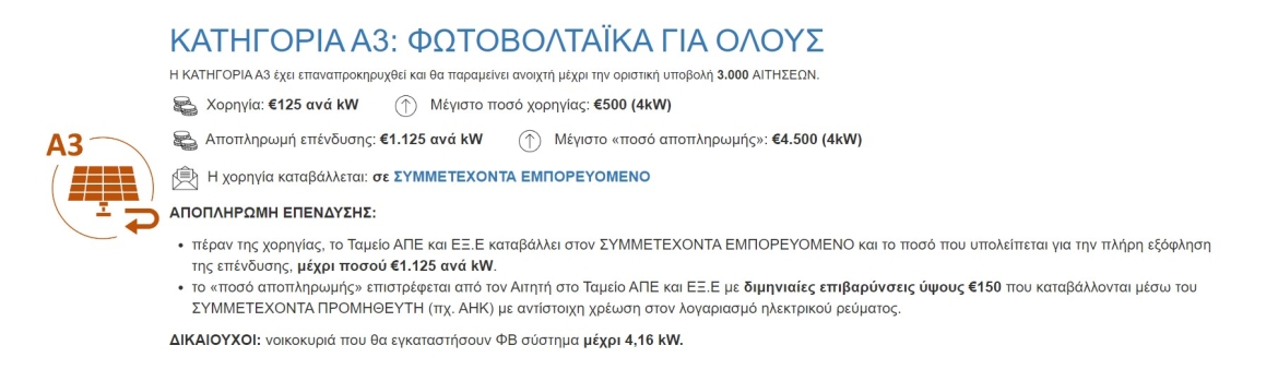 Στο πλαίσιο αυτό μετά την επιτυχία της πρώτης φάσης του Σχεδίου Χορηγιών «Φωτοβολταϊκά για Όλους» με αιτήσεις που ξεπέρασαν τις 6.000 μέσα σε 4 μήνες, το Υπουργείο Ενέργειας, Εμπορίου και Βιομηχανίας ανακοινώνει την επαναπροκήρυξη της Κατηγορίας Α3: «Φωτοβολταϊκά για Όλους».