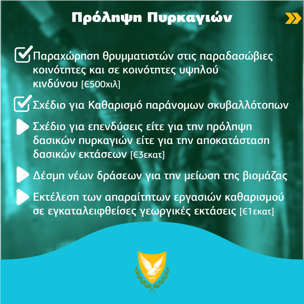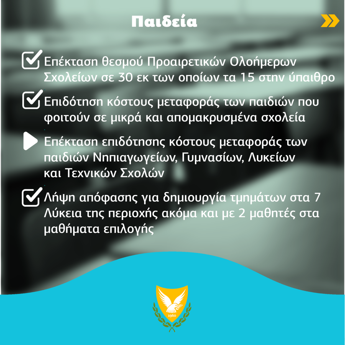 Οι δράσεις συγκεκριμένα αφορούν την αναβάθμιση προσφερόμενων υπηρεσιών στην υγεία, την επέκταση του θεσμού των Προαιρετικών Ολοήμερων Σχολείων σε όλα τα σχολεία της υπαίθρου, καθώς και τη δημιουργία νέων τμημάτων Λυκείων στον τομέα της εκπαίδευσης, την κατασκευή αθλητικών υποδομών, την αύξηση της χρηματοδότησης στον τομέα της κοινωνικής ευημερίας, την επένδυση στην πρόληψη πυρκαγιών με την κατασκευή ελικοδρομίου στη Λινού, πυροσβεστικών σταθμών, τη δημιουργία Τράπεζας Αγροτεμαχίων και άλλων καινοτόμων μέτρων και πρακτικών πρόληψης, τη λήψη μέτρων προώθησης της ανάπτυξης και της επιχειρηματικότητας με την απλοποίηση των αδειοδοτήσεων και των διαδικασιών αξιοποίησης των χρηματοδοτικών σχεδίων, την προώθηση του πρωτογενούς τομέα με τη μείωση του κόστους της ενέργειας και του κόστους άρδευσης, τη χρηματοδότηση μέτρων αναβάθμισης και προώθησης του τουριστικού προϊόντος, τη βελτίωση του οδικού δικτύου και των δημόσιων επιβατικών μεταφορών, όπως και με τη βελτίωση των ηλεκτρονικών επικοινωνιών με την επέκταση του δικτύου Fiber optics και στο τελευταίο χωριό.