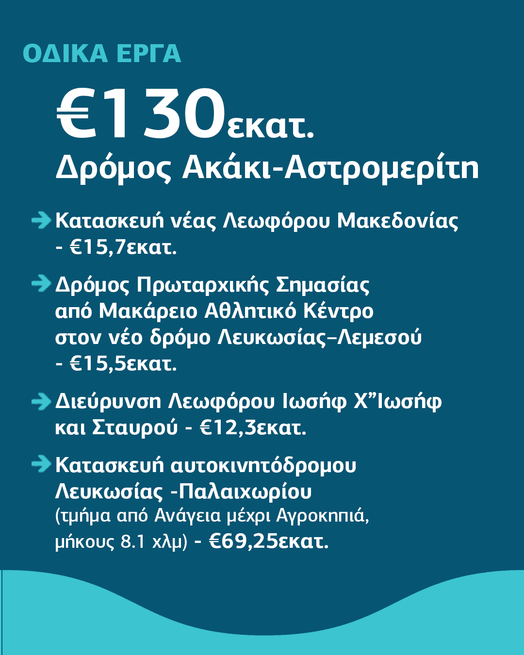 • Περιμετρικός Λευκωσίας (120 εκατ.), Λευκωσία–Τρόοδος (88+130 εκατ.), Λευκωσία–Παλαιχώρι (65 εκατ.)
