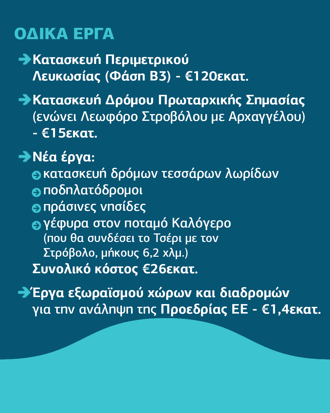 • Αναπλάσεις: Τάφρος, Λεωφόρος Κωνσταντίνου Παλαιολόγου, δρόμος Τσέρι–Στρόβολος με γέφυρα (€26 εκατ.)