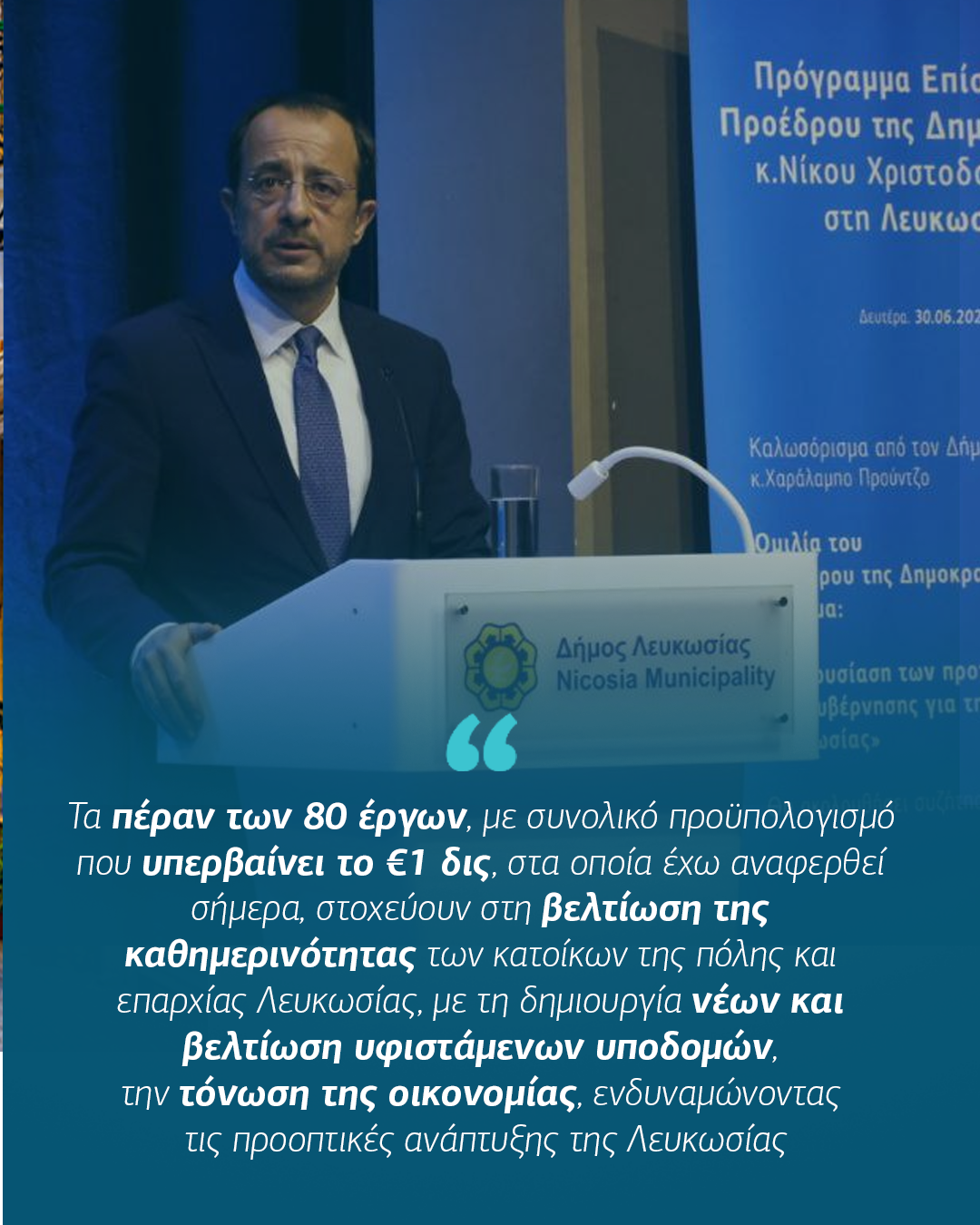 Όπως ο ίδιος ο Πρόεδρος της Δημοκρατίας υπογράμμισε: «Η Λευκωσία δεν είναι απλώς η καρδιά της Κύπρου, αλλά η πόλη που αναπτύσσεται με στρατηγικό σχεδιασμό και κοινωνική ευαισθησία, προκειμένου να δημιουργηθεί ένα σύγχρονο, βιώσιμο και ανθρωποκεντρικό μέλλον για όλους τους κατοίκους της».