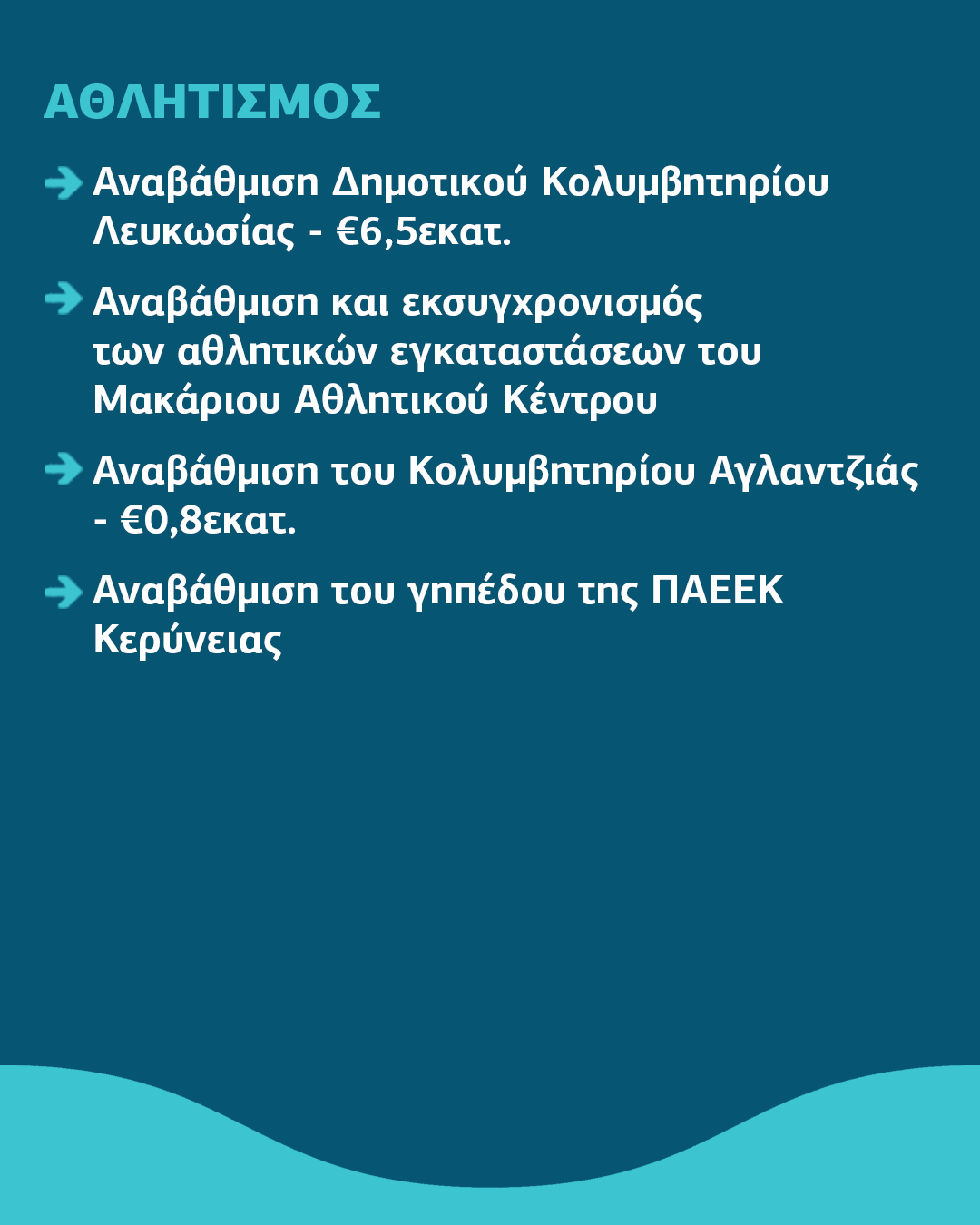 • Αναβάθμιση Δημοτικού Κολυμβητηρίου Λευκωσίας (€6,5 εκατ.)