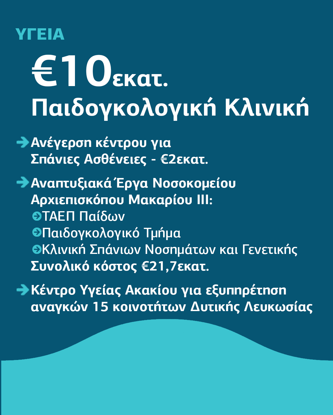 • Αναβάθμιση των νοσοκομείων Λευκωσίας & Μακαρίου: νέες πτέρυγες, Stroke Unit, παιδοογκολογική με δωρεά (€8,5 εκατ.)
