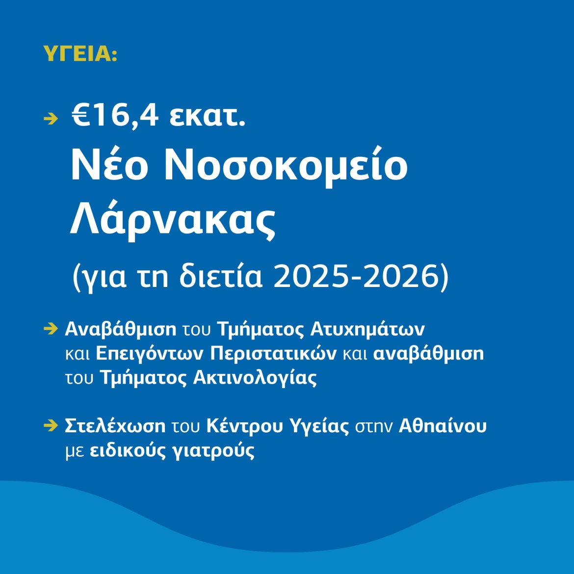 - Η βελτίωση της Υγείας, με έργα ύψους 16,4 εκατ. ευρώ στο Νέο Νοσοκομείο Λάρνακας και την αναβάθμιση της πρωτοβάθμιας φροντίδας στην ύπαιθρο.
