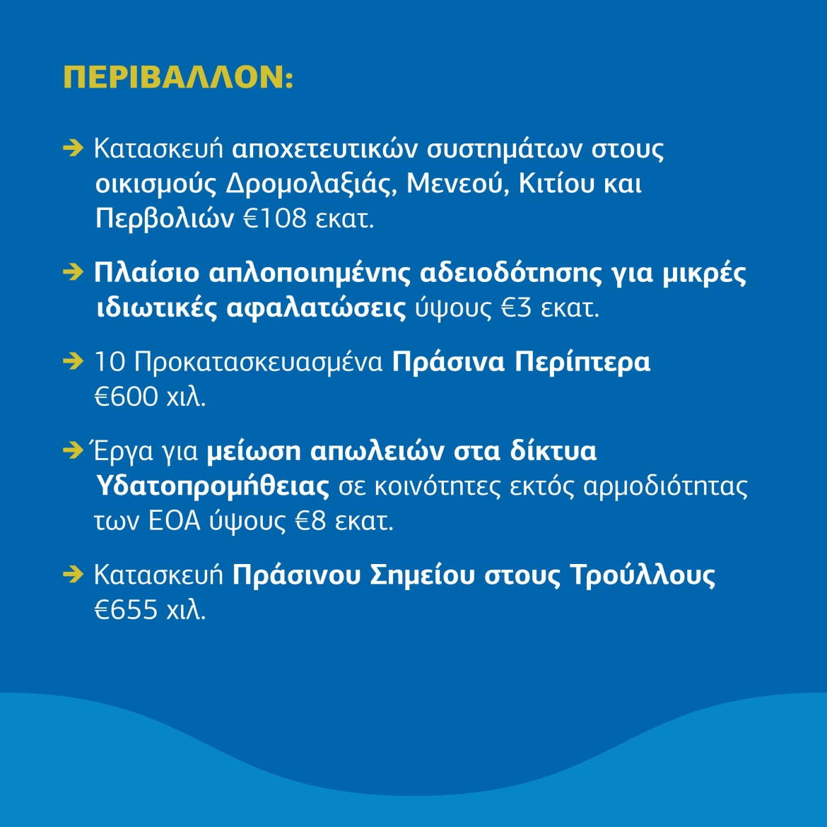 - Η επιτάχυνση έργων περιβαλλοντικής διαχείρισης, με αναβαθμίσεις στους ΟΕΔΑ Κόσιης και Πεντακώμου, εγκατάσταση Πράσινων Περιπτέρων και εφαρμογή του συστήματος "Πληρώνω όσο Πετώ".