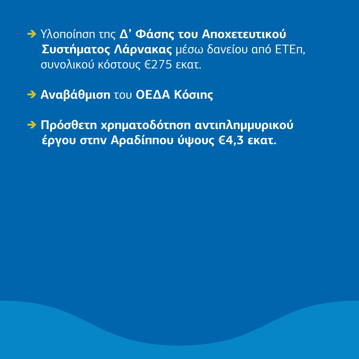 - Η υλοποίηση του αντιπλημμυρικού έργου στην Αραδίππου, με ενισχυμένη χρηματοδότηση 4,3 εκατ. ευρώ.