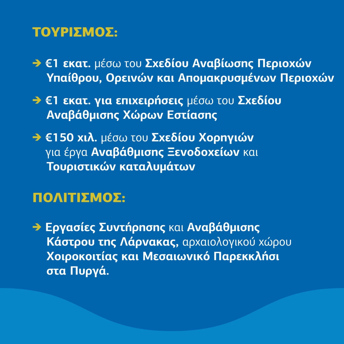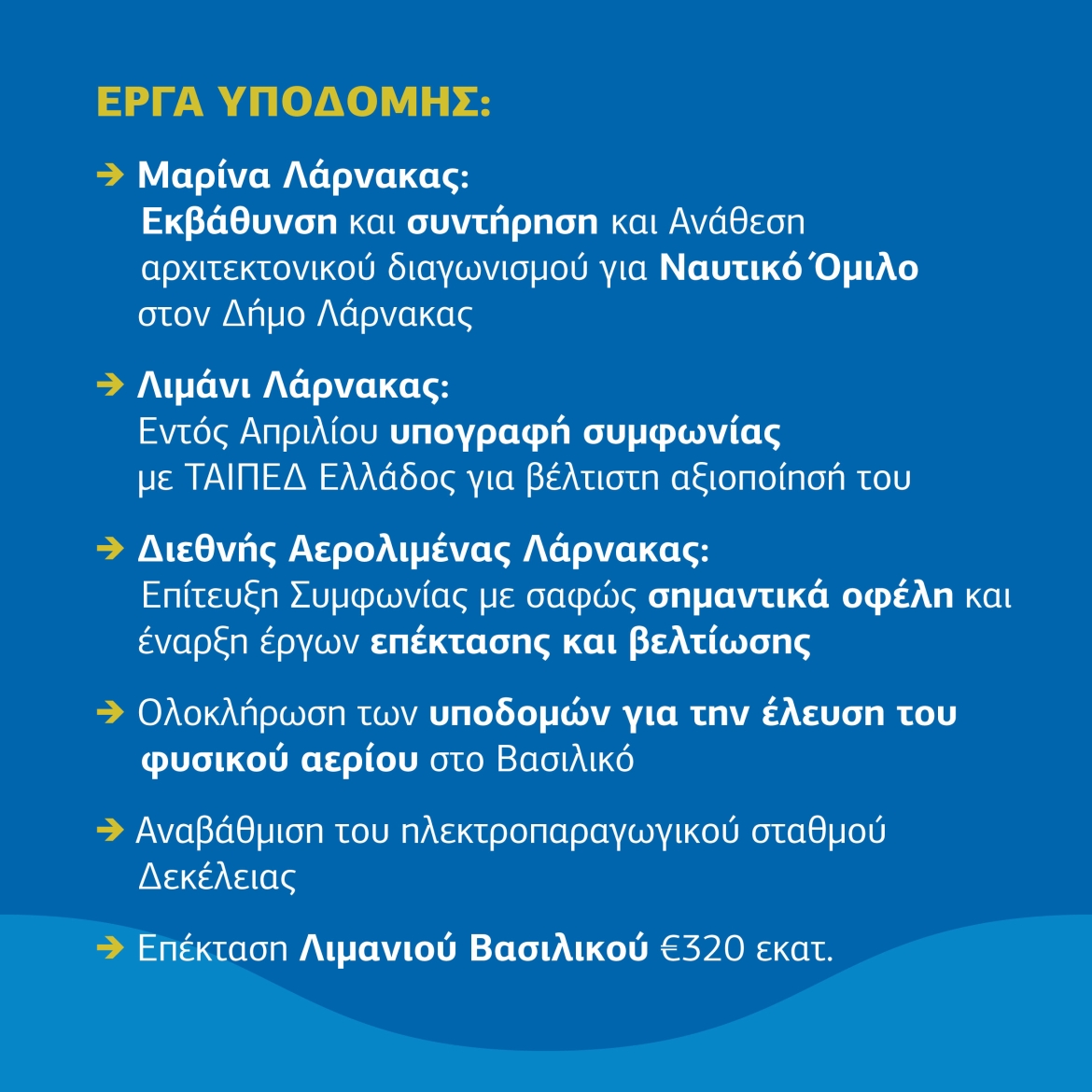 - Η αναβάθμιση της Μαρίνας και του Λιμανιού Λάρνακας, με επιταχυνόμενες διαδικασίες για την αξιοποίηση του θαλάσσιου μετώπου.