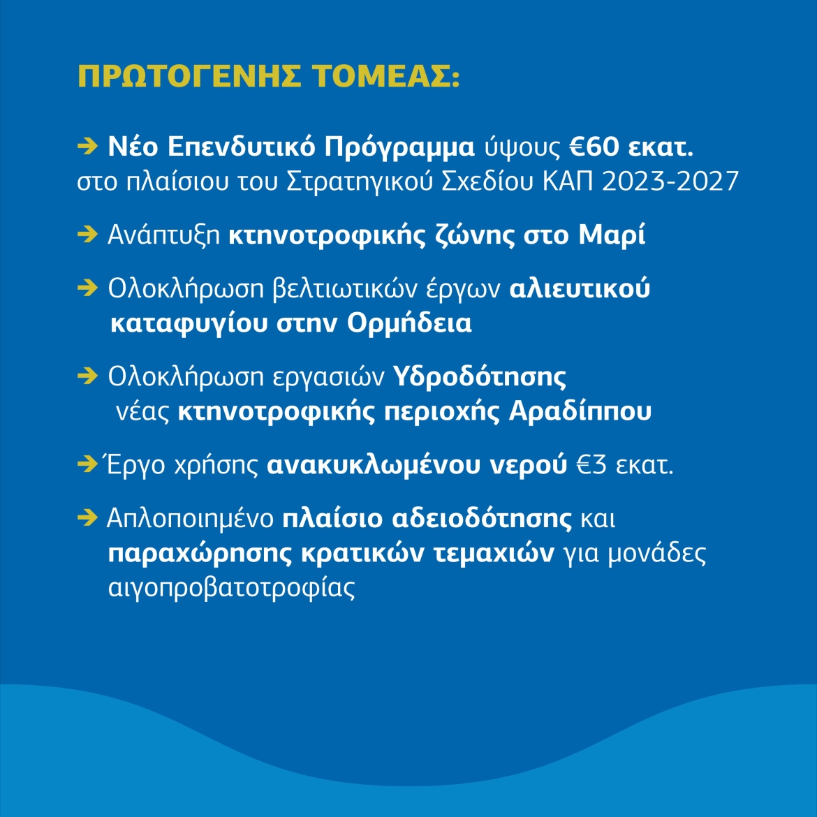 - Η στήριξη νέων κτηνοτρόφων μέσω παραχώρησης κρατικών τεμαχίων και χρηματοδοτήσεων έως 600 χιλιάδων ευρώ.