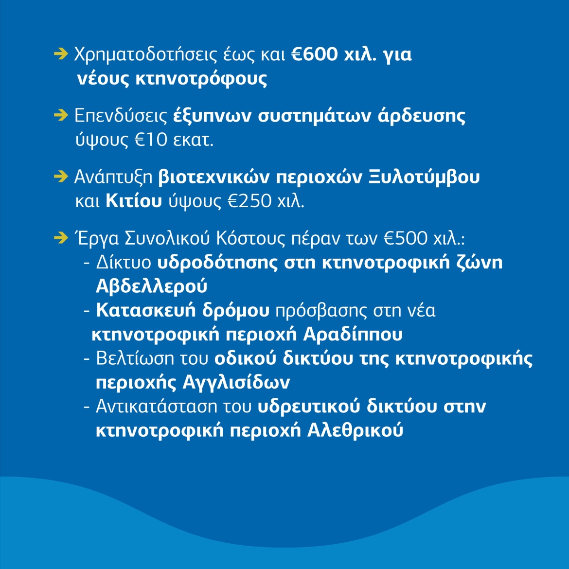 - Η ενίσχυση του πρωτογενούς τομέα, με έργα υποδομής στις κτηνοτροφικές ζώνες Αραδίππου, Αγγλισίδων, Αβδελλερού και Αλεθρικού.