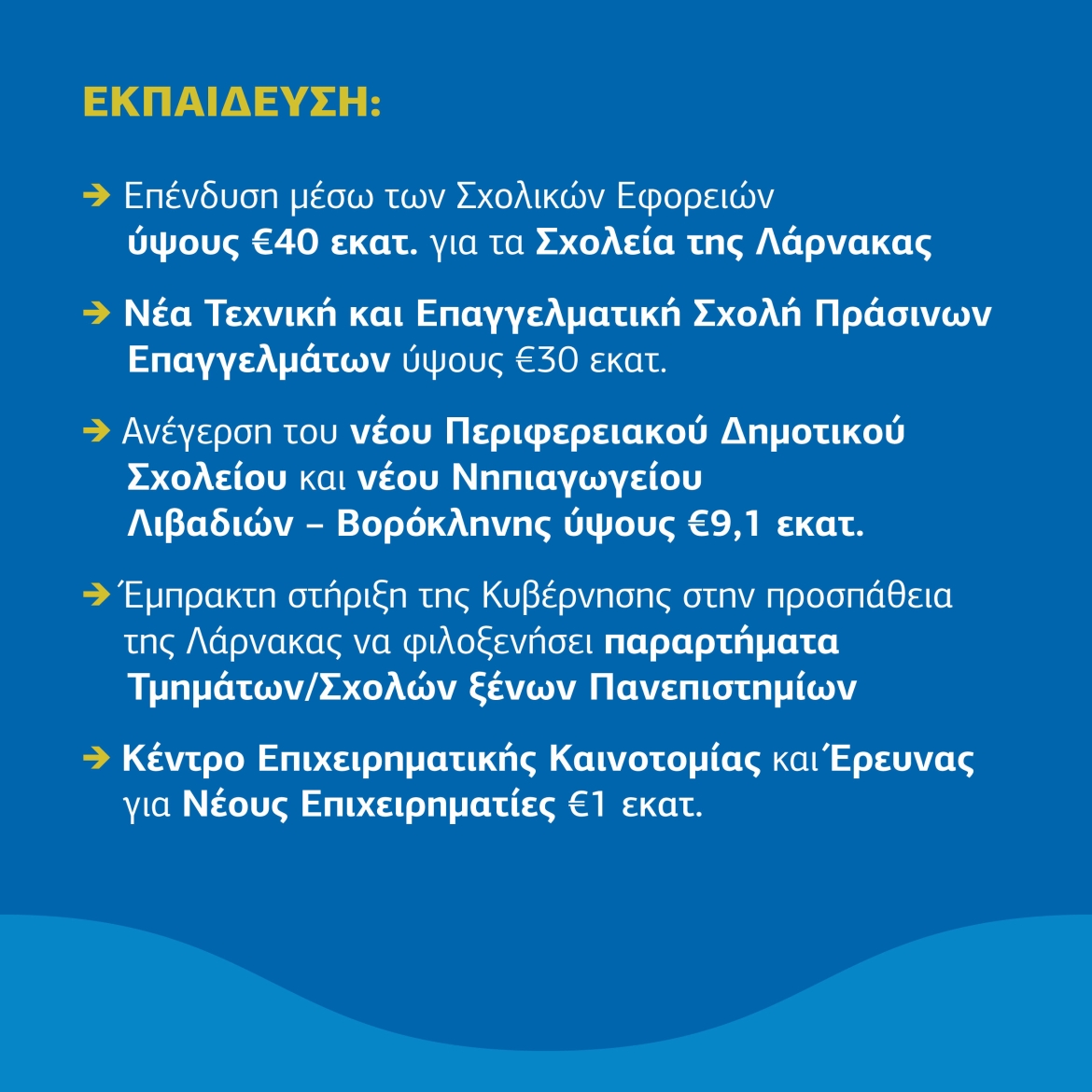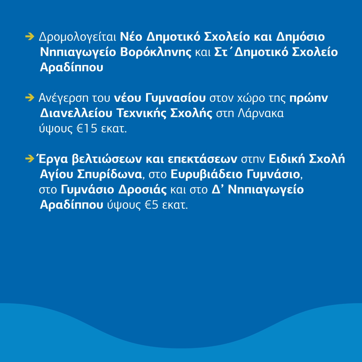 - Η ανέγερση του νέου Γυμνασίου στον χώρο της πρώην Διανελλείου Τεχνικής Σχολής στη Λάρνακα, ύψους 15 εκατ. ευρώ.