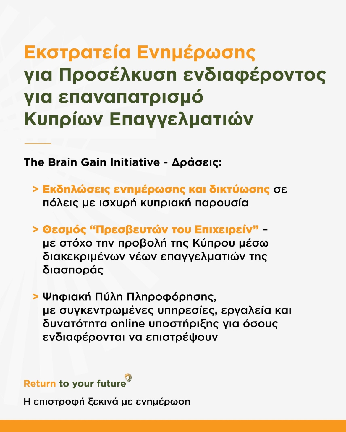 Αποτελεί έναν στοχευμένο χάρτη πορείας με σαφές χρονοδιάγραμμα και συγκεκριμένες δράσεις που διευκολύνουν και ενθαρρύνουν την επιστροφή στην πατρίδα.