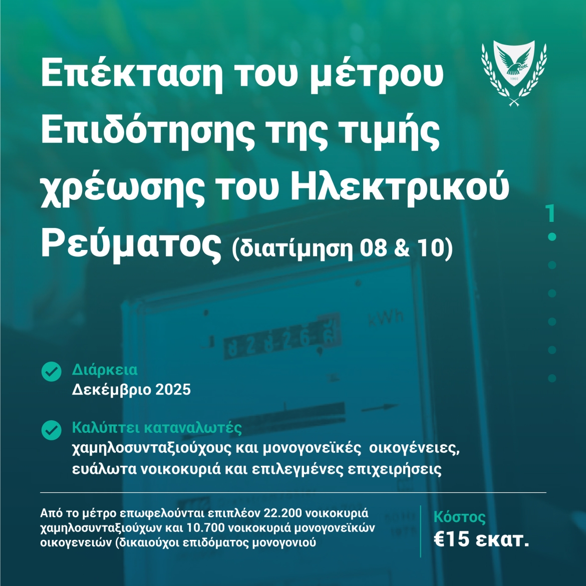 - Αναφορικά με την υφιστάμενη επιδότηση της τιμής χρέωσης του ηλεκτρικού ρεύματος για την ειδική οικιακή διατίμηση ευάλωτων καταναλωτών (Κώδικας 08) και της εμπορικής χρήσης (διατίμηση 010), δηλαδή τα ευάλωτα νοικοκυριά και επιλεγμένες επιχειρήσεις, αντίστοιχα, το Υπουργικό Συμβούλιο αποφάσισε την επέκταση του μέτρου, ώστε να καλύψει τους χαμηλοσυνταξιούχους και μονογονεϊκές οικογένειες. Συγκεκριμένα, από το μέτρο επωφελούνται επιπλέον 22.200 νοικοκυριά χαμηλοσυνταξιούχων και 10.700 νοικοκυριά μονογονεϊκών οικογενειών, που είναι δικαιούχοι επιδόματος μονογονιού. Η συγκεκριμένη επιδότηση θα ισχύει μέχρι τον Δεκέμβριο του 2025. Το εκτιμώμενο κόστος του μέτρου είναι €25 εκατ.
