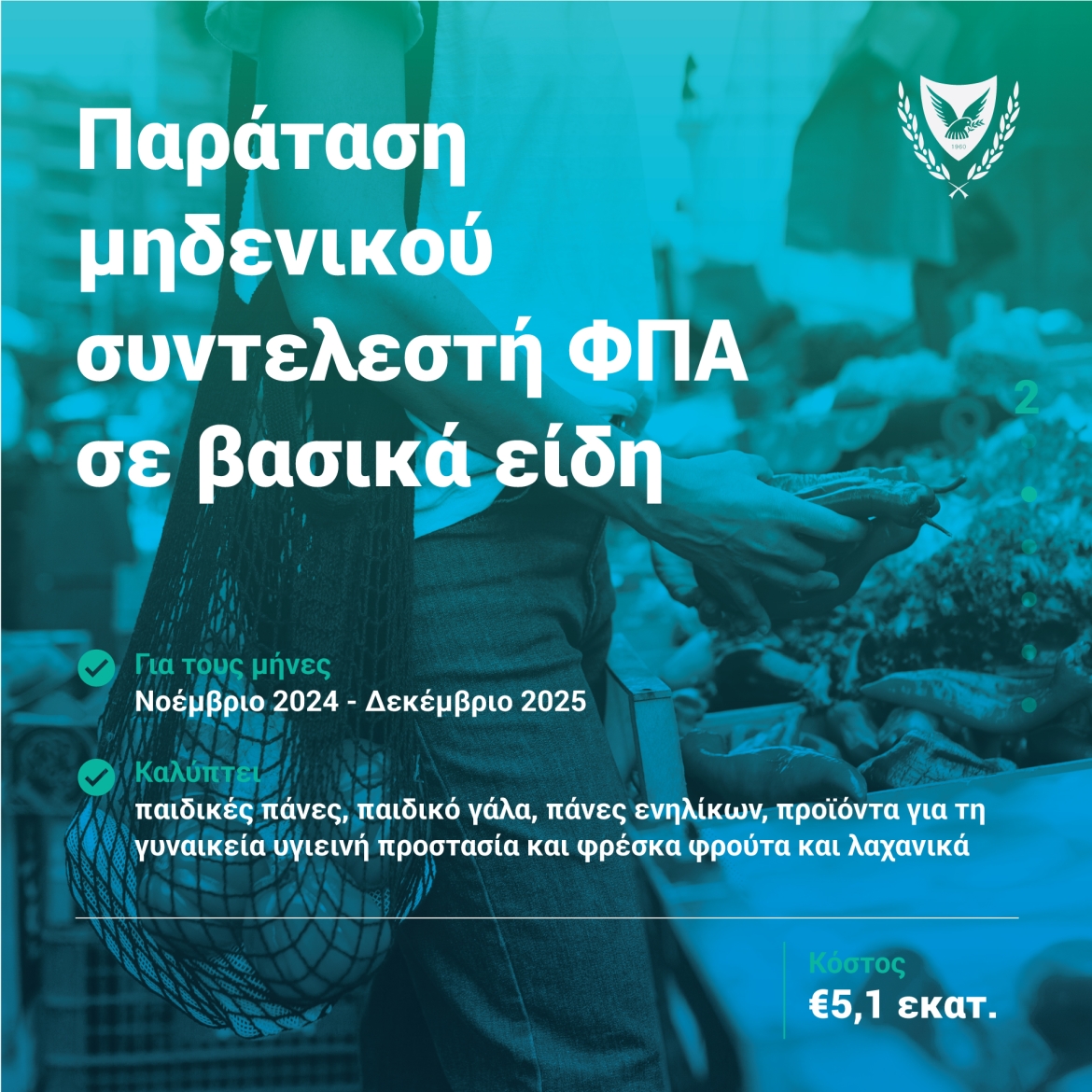 - Το Υπουργικό Συμβούλιο επικύρωσε επίσης το μέτρο που είχε ανακοινώσει στις 10 Οκτωβρίου 2024 ο Υπουργός Οικονομικών για την επιβολή μηδενικού συντελεστή ΦΠΑ σε παιδικές πάνες, παιδικό γάλα, πάνες ενηλίκων, προϊόντα για τη γυναικεία υγιεινή προστασία και φρέσκα φρούτα και λαχανικά. Το μέτρο θα τεθεί σε εφαρμογή στις 4 Νοεμβρίου 2024 και θα ισχύει μέχρι το τέλος του 2025. Το συνολικό εκτιμώμενο κόστος του εν λόγω μέτρου ανέρχεται στα €5,1 εκατ.