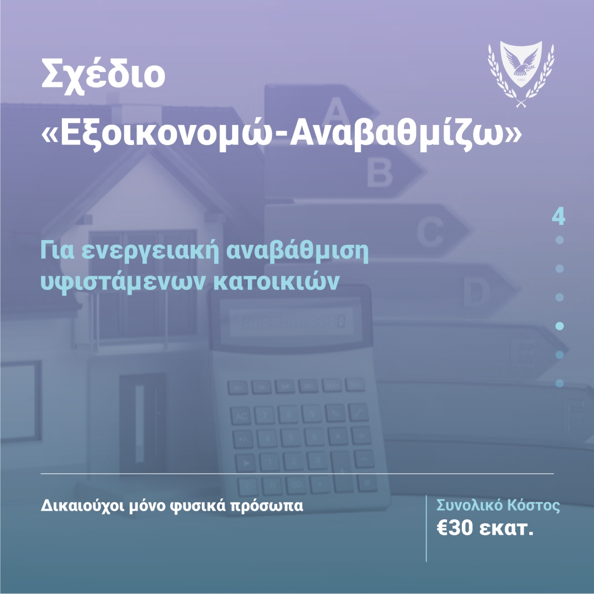 - Διάθεση επιπλέον ποσού €30 εκατ. για το Σχέδιο «Εξοικονομώ-Αναβαθμίζω» στις κατοικίες για ενεργειακή αναβάθμιση υφιστάμενων κατοικιών. Δικαιούχοι είναι μόνο φυσικά πρόσωπα.