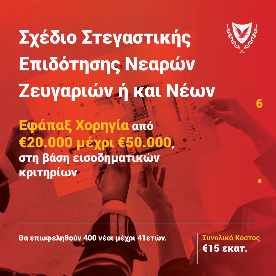 - Το Υπουργείο Εσωτερικών θέτει σε εφαρμογή το Σχέδιο στεγαστικής επιδότησης νεαρών ζευγαριών ή και νέων μέχρι 41 ετών με παραχώρηση εφάπαξ χορηγίας από €20.000 μέχρι €50.000, στη βάση εισοδηματικών κριτηρίων.Με το μέτρο αυτό, συνολικής δαπάνης €15 εκατ. θα επωφεληθούν 400 νέοι.