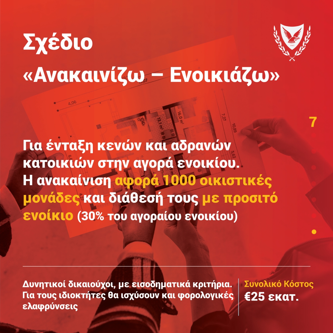 - Το Υπουργείο Εσωτερικών αρχίζει από 15/11/2024 την αποδοχή αιτήσεων του Σχεδίου «Ανακαινίζω – Ενοικιάζω» για ένταξη κενών και αδρανών κατοικιών στην αγορά ενοικίου. Η ανακαίνιση αφορά 1000 οικιστικές μονάδες και διάθεσή τους με προσιτό ενοίκιο (30% του αγοραίου ενοικίου) σε δυνητικούς δικαιούχους, με εισοδηματικά κριτήρια. Για τους ιδιοκτήτες θα ισχύσουν και φορολογικές ελαφρύνσεις. Συνολικό εκτιμώμενο κόστος €25 εκατ.