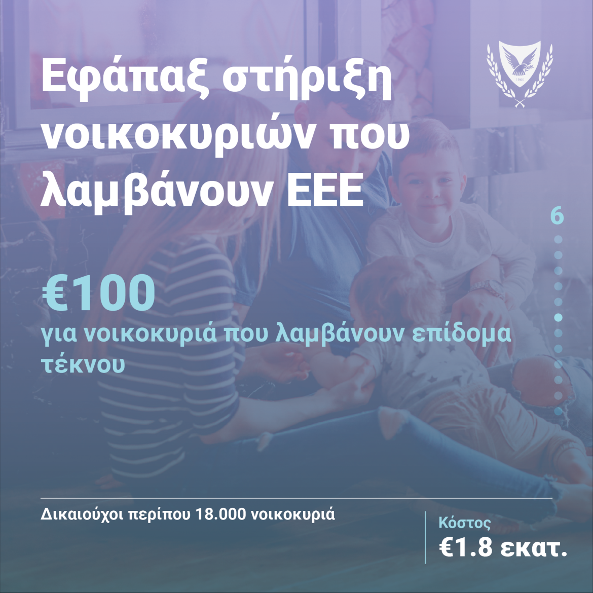 - Εφάπαξ στήριξη για κάθε τέκνο με μέγιστο ποσό 250 ευρώ σε μονογονεϊκές οικογένειες. Οικογένειες με πέραν των τεσσάρων εξαρτώμενων τέκνων θα λαμβάνουν επιπρόσθετο ποσό.