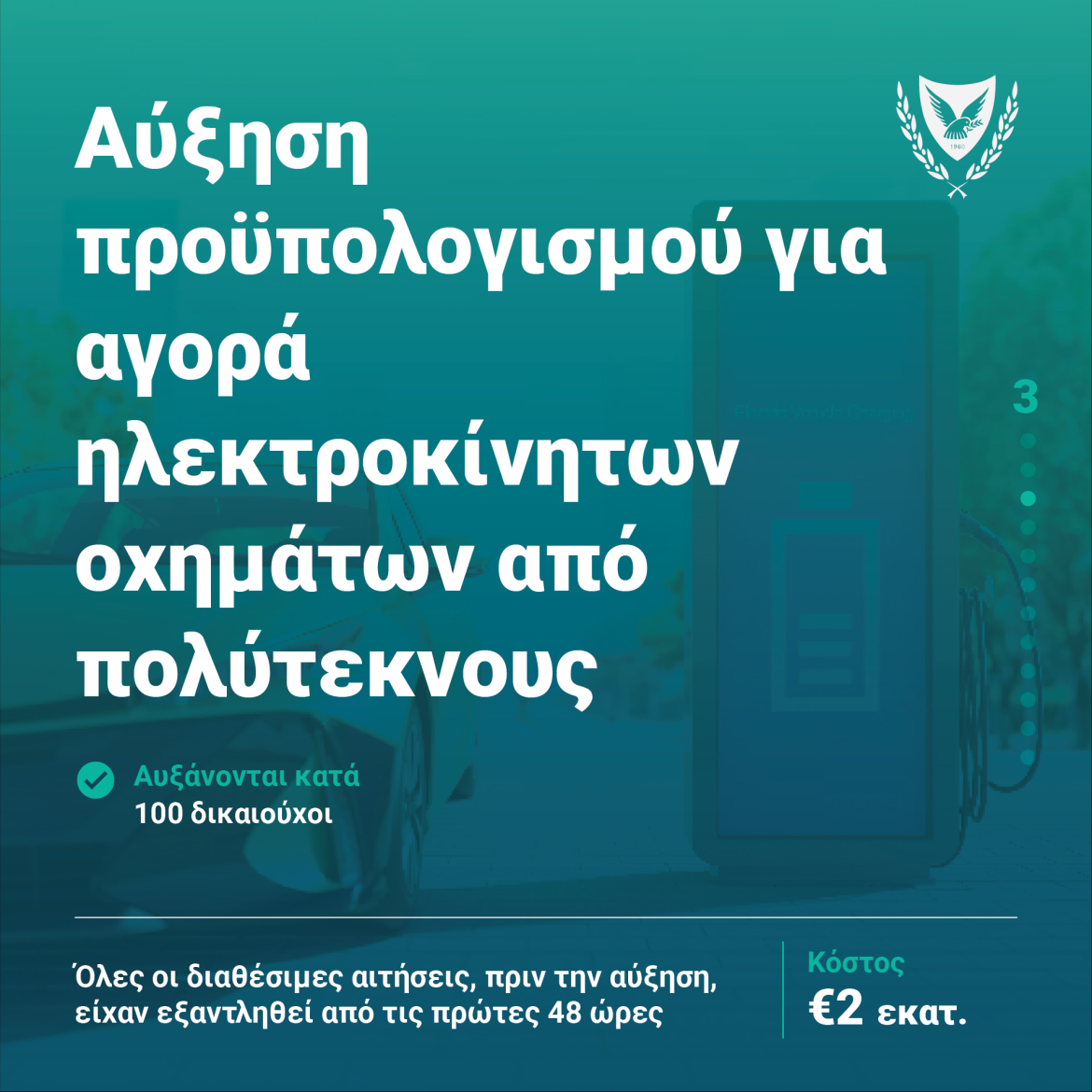 - Για στήριξη των πολυτέκνων οικογενειών και λαμβάνοντας υπόψη το μεγάλο ενδιαφέρον που έχει επιδειχθεί για την αγορά ηλεκτρικών αυτοκινήτων μέσω του προγράμματος χορηγιών για την ηλεκτροκίνηση που έχουμε εξαγγελθεί πρόσφατα, αυξάνεται ο σχετικός προϋπολογισμό κατά δύο εκ. ευρώ.
