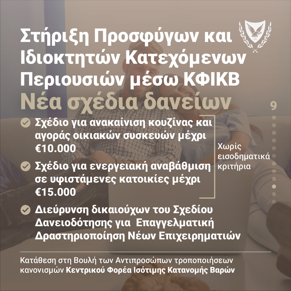- Το Σχέδιο Επιδότησης Επιτοκίου για Στεγαστικά Δάνεια για αγορά και ανέγερση πρώτης κατοικίας, που ανακοινώθηκε τον Οκτώβριο του 2023, έχει λάβει τη σχετική έγκριση της Ευρωπαϊκής Επιτροπής και τίθεται σε άμεση ισχύ.
