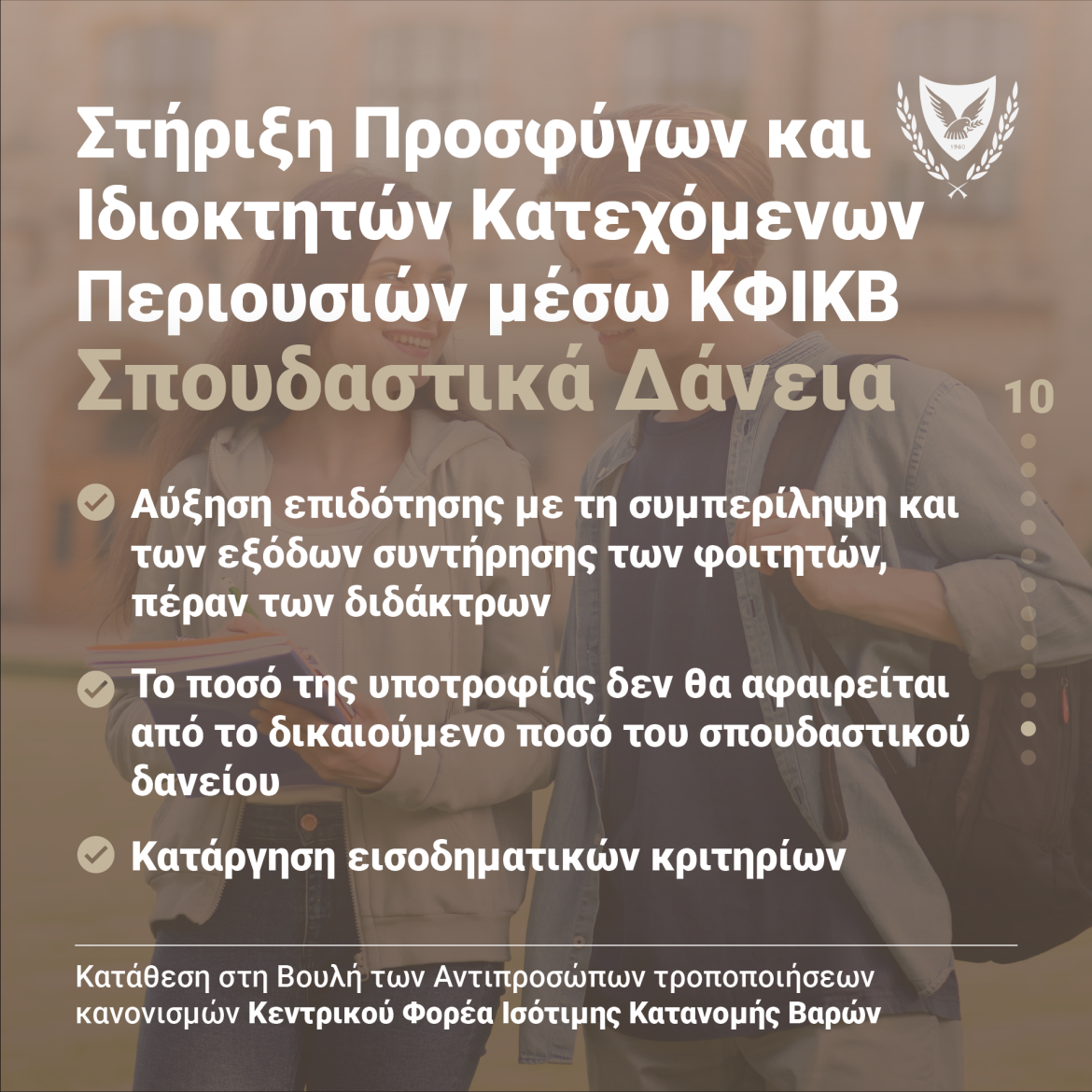 - Αύξηση της επιδότησης για φοιτητές με τη συμπερίληψη και των εξόδων συντήρησής τους πέραν των διδάκτρων, ενώ την ίδια στιγμή το ποσό τυχόν υποτροφίας δεν θα αφαιρείται, ως ίσχυε μέχρι σήμερα, από το ποσό του σπουδαστικού δανείου.