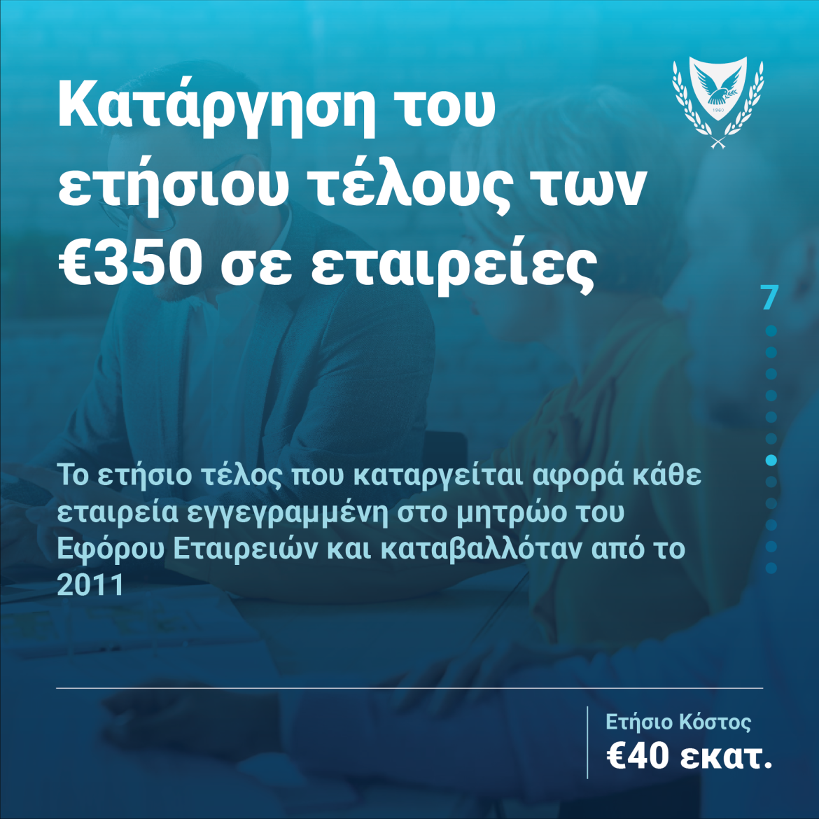 - Για πρόσθετη ελάφρυνση, αλλά και στήριξη των επιχειρήσεων, κατάργηση του ετήσιου τέλους εταιρειών των 350 ευρώ που επιβλήθηκε το 2011.